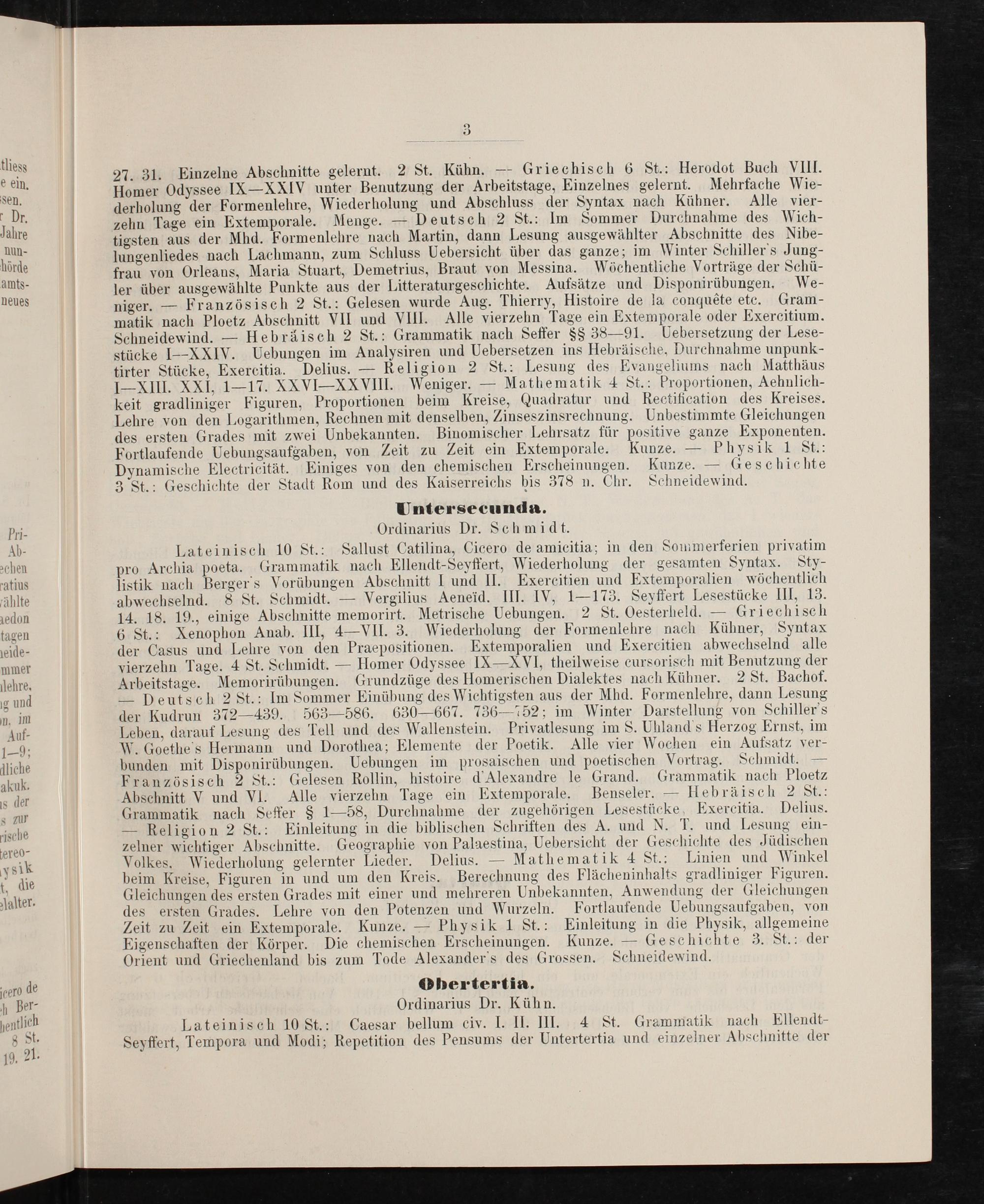 Untersecunda. Ordinarius Dr. Schmidt. Lateinisch 10 St.: Sallust Catilina, Cicero de amicitia; in den Sommerferien privatim pro Archia poeta. Grammatik nach Ellendt-Seyffert, Wiederholung der gesamten SyntaXx. Sty- listik nach Berger’s Vorübungen Abschnitt I und II. Exercitien und Extemporalien wöchentlich