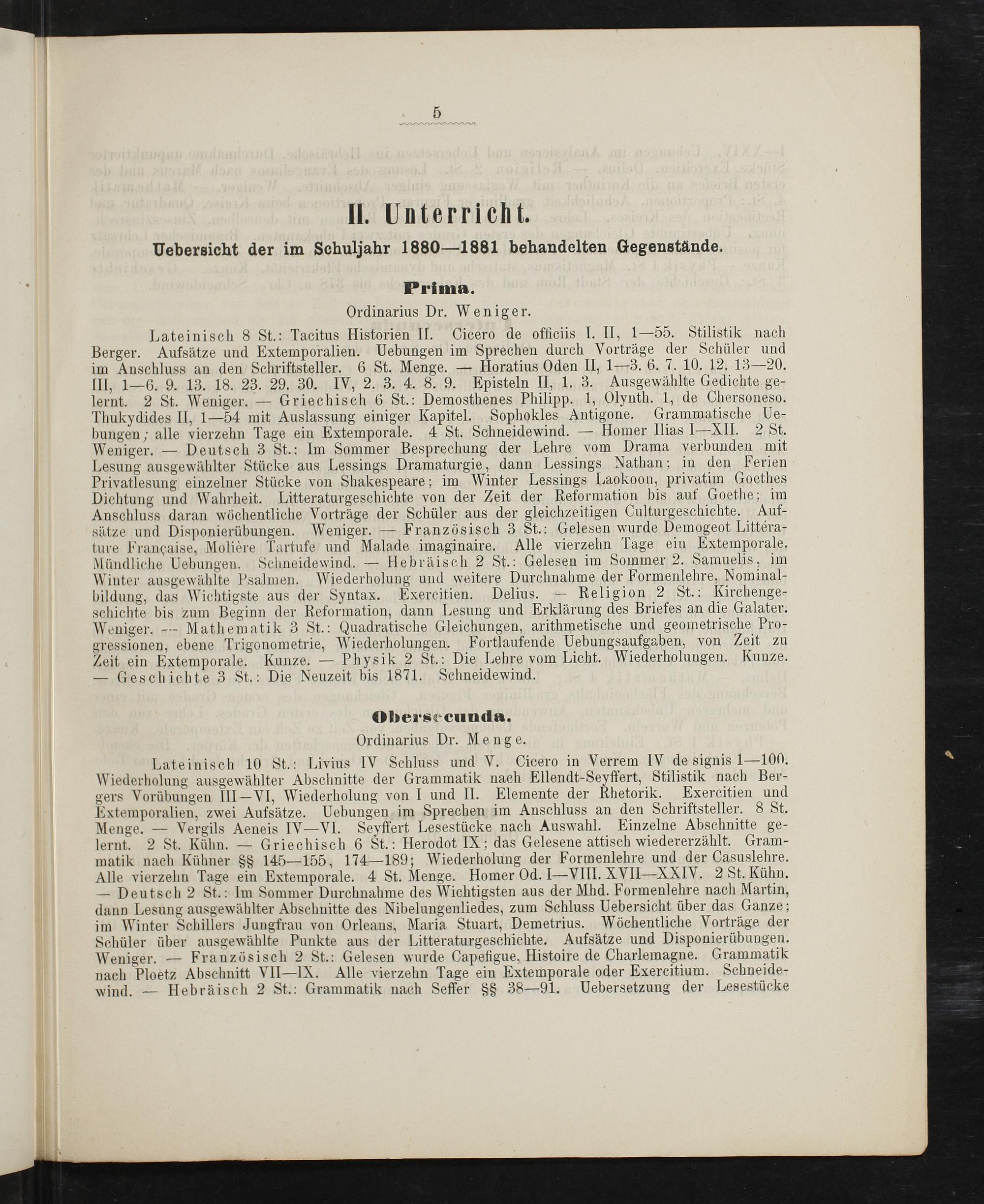 Lateinisch 8 St.: Tacitus Historien II. Cicero de officiis I. II, 1—55. Stilistik nach Berger. Aufsätze und Extemporalien. Uebungen im Sprechen durch Vorträge der Schüler und im Anschluss an den Schriftsteller. 6 St. Menge.— Horatius Oden II, 1—3. 6. 7. 10. 12. 13—20. III, 1—6. 9. 13. 18. 23. 29. 30. IV, 2. 3. 4. 8. 9. Episteln II. 1. 3. Ausgewählte Gedichte ge- lernt. 2 St. Weniger.— Griechisch 6 St.: Demosthenes Philipp. 1, Olynth. 1, de Chersoneso. Thukydides II, 1—54 mit Auslassung einiger Kapitel. Sophokles Antigone. Grammatische Ue- bungen; alle vierzehn Tage ein Extemporale. 4 St. Schneidewind.— Homer Ilias 1I—XlI. 2 St. Weniger.— Deutsch 3 St.: Im Sommer Besprechung der Lehre vom Drama verbunden mit Lesung ausgewählter Stücke aus Lessings Dramaturgie, dann Lessings Nathan; in den Ferien Privatlesung einzelner Stücke von Shakespeare; im Winter Lessings Laokoon, privatim Goethes Dichtung und Wahrheit. Litteraturgeschichte von der Zeit der Reformation bis auf Goethe; im Anschluss daran wöchentliche Vorträge der Schüler aus der gleichzeitigen Culturgeschichte. Auf- sätze und Disponierübungen. Weniger.— Französisch 3 St.: Gelesen wurde Demogeot Littéra- ture Francçaise, Moliére Tartufe und Malade imaginaire. Alle vierzehn Tage ein Extemporale, Mündliche Uebungen. Schneidewind.— Hebräisch 2 St. Gelesen im Sommer 2. Samuelis, im Winter ausgewählte Psalmen. Wiederholung und weitere Durchnahme der Formenlehre, Nominal- bildung, das Wichtigste aus der Syntax. Exercitien. Delius.— Religion 2 St.: Kirchenge- schichte bis zum Beginn der Reformation, dann Lesung und Erklärung des Briefes an die Galater. Weniger.— Mathematik 3 St.: Quadratische Gleichungen, arithmetische und geometrische Pro- gressionen, ebene Trigonometrie, Wiederholungen. Fortlaufende Uebungsaufgaben, von Zeit zu Zeit ein Extemporale. Kunze.— Physik 2 St.: Die Lehre vom Licht. Wiederholungen. Kunze. — Geschichte 3 St.: Die Neuzeit bis 1871. Schneidewind.