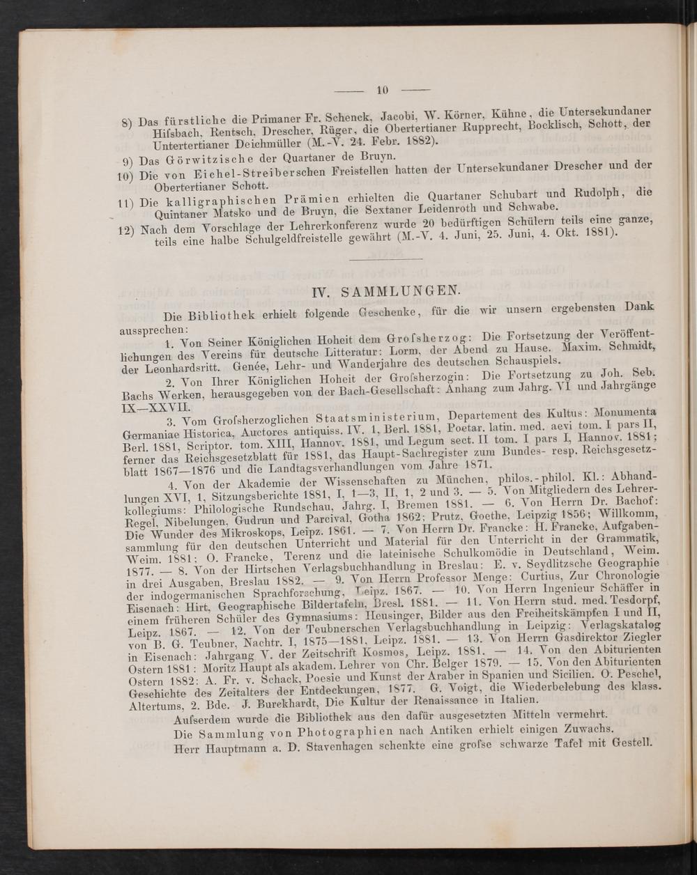 4. Von der Akademie der Wissenschaften zu München, philos.-philol. Kl.: Abhand- lungen XVI, 1, Sitzungsberichte 1881, I. 1— 3, II. 1, 2 und 3.— 5. Von Mitgliedern des Lehrer- kollegiums: Philologische Rundschau, Jahrg. I, Bremen 1881.— 6. Von Herrn Dr. Bachof: Regel. Nibelungen, Gudrun und Parcival, Gotha 1862; Prutz, Goethe, Leipzig 1856; Willkomm, Die Wunder des Mikroskops, Leipz. 1861.— 7. Von Herrn Dr. Francke: H. Francke, Aufgaben- sammlung für den deutschen Unterricht und Material für den Unterricht in der Grammatik, Weim. 1881; O. Francke, Terenz und die lateinische Schulkomödie in Deutschland, Weim. 1877.— 8. Von der Hirtschen Verlagsbuchhandlung in Breslau: E. v. Seydlitzsche Geographie in drei Ausgaben, Breslau 1882.— 9. Von Herrn Professor Menge: Curtius, Zur Chronologie der indogermanischen Sprachforschung, Leipz. 1867.— 10. Von Herrn Ingenieur Schäffer in Eisenach: Hirt, Geographische Bildertafeln, Bresl. 1881.— 11. Von Herrn stud. med. Tesdorpf, einem früheren Schüler des Gymnasiums: Heusinger, Bilder aus den Freiheitskämpfen I und II, Leipz. 1867.— 12. Von der Teubnerschen Verlagsbuchhandlung in Leipzig: Verlagskatalog von B. G. Teubner, Nachtr. I, 1875— 1881, Leipz. 1881.— 13. Von Herrn Gasdirektor Ziegler in Eisenach: Jahrgang V. der Zeitschrift Kosmos, Leipz. 1881.— 14. Von den Abiturienten Ostern 1881: Moritz Haupt als akadem. Lehrer von Chr. Belger 1879.— 15. Von den Abiturienten Ostern 1882: A. Fr. v. Schack, Poesie und Kunst der Araber in Spanien und Sicilien. O. Peschel Geschichte des Zeitalters der Entdeckungen, 1877. G. Voigt, die Wiederbelebung des klass. Altertums, 2. Bde. J. Burekhardt, Die Kultur der Renaissance in Italien.