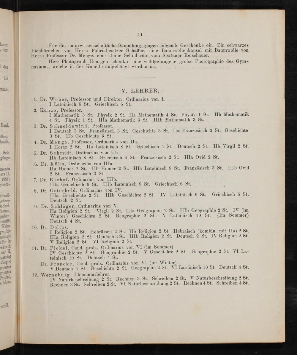 Weber, Professor und Direktor, Ordinarius von I. I Lateinisch 6 St. Griechisch 6 St.