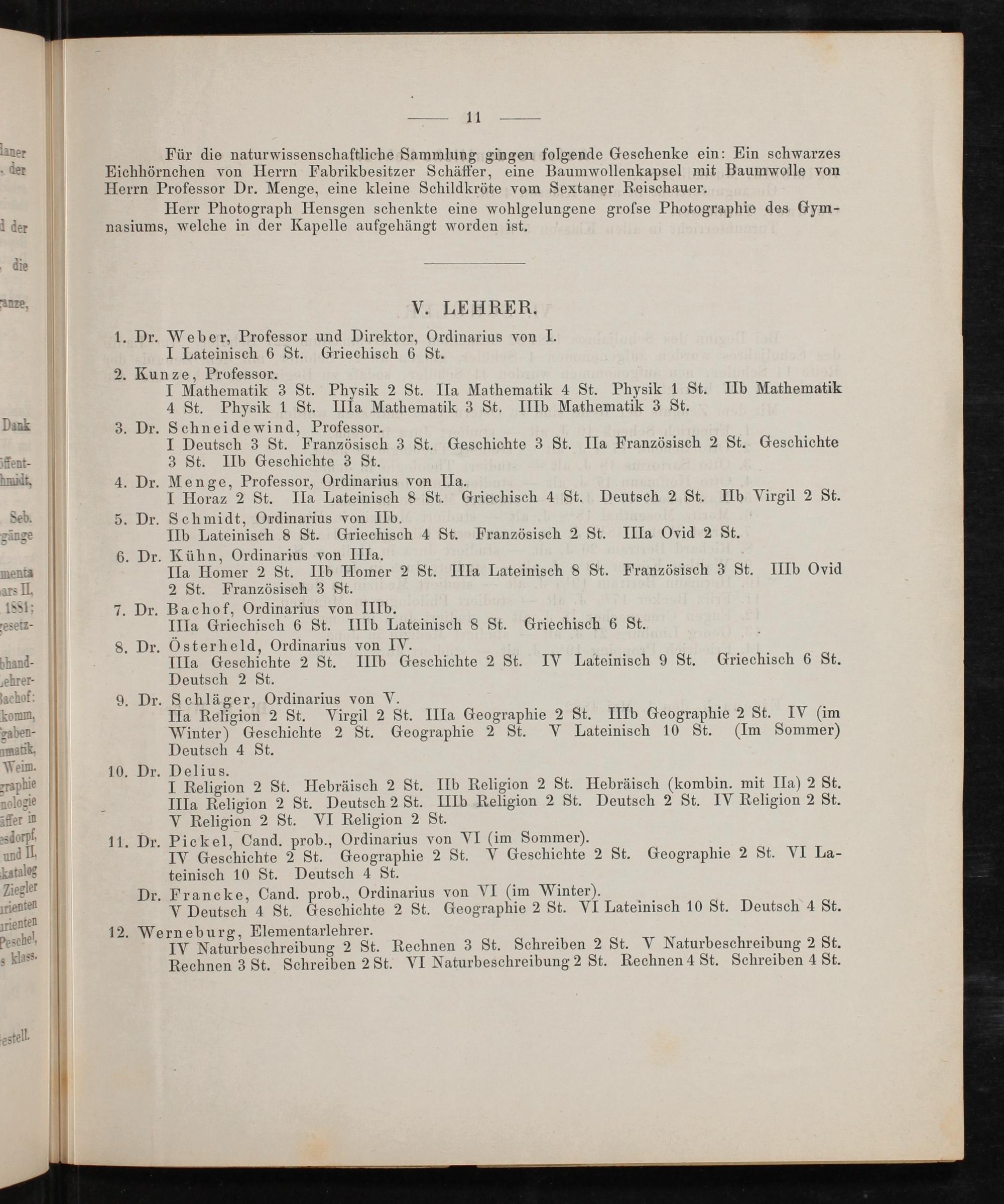 Menge, Professor, Ordinarius von IIa. I Horaz 2 St. IIa Lateinisch 8 St. Griechisch 4 St. Deutsch 2 St. IIb Virgil 2 St.