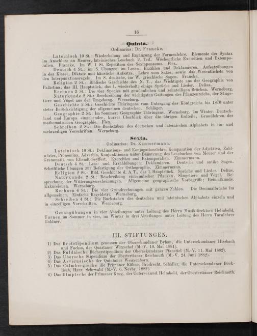 Deutsch 4 St.: im S. UÜbungen im Lesen, Erzählen und Deklamieren. Aufsatzübungen in der Klasse, Diktate und hausliche Aufsätze. Lehre vom Satze, sowie das Wesentlichste von den Interpunktionsregeln. Im S. deutsche, im W. griechische Sagen. Francke.