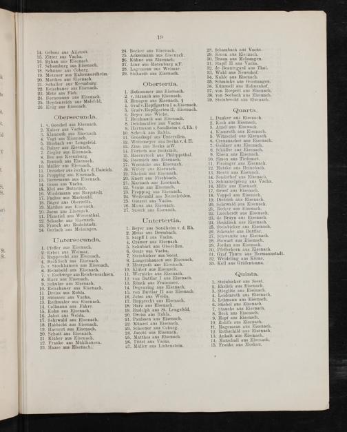 19 14. Gebser aus Allstedt. 24. Becker aus Eisenach. 28. Schambach aus Vacha. 15. Zitter aus Vacha. 25. Ackermann aus Eisenach. 29. Simon aus Eisenach. 16. Byhan aus Eisenach. 26. Kühne aus Eisenach. 30. Braun aus Melsungen. 17. Schomburg aus Eisenach. 27. Linz aus Rotenburg a/F. 31. Stapff II aus Vacha. 18. Schöner aus Coburg. 28. Lagemann aus Weimar. 32. de Beauregard aus Thal. k 19. Metzner aus Kaltennordheim. 29. Sichardt aus Eisenach. 33. Wahl aus Neuenhof. 20. Matthes aus Eisenach. 34. Kahle aus Eisenach. 21. Schaller aus Kreuzburg. Obertertia 35. Schminke aus Gerstungen. 22. Reischauer aus Eisenach. 7. 36. Kümmell aus Hahnenhof. te 23. Metz aus Floh. 1. Hofsommer aus Eisenach. 37. von Roepert aus Eisenach. 24. Bornemann aus Eisenach. 2. v. Strauch aus Eisenach. 38. von Seebach aus Eisenach. 25. Heydenreich aus Malsfeld. 3. Hensgen aus Eisenach. † 39. Steinbrecht aus Eisenach. 26. Krug aus Eisenach. 4. Graf v. Hopffgarten I a. Eisenach. 2 F. rA V Ternr 1 di 2 30 t.. 5 rateddenaEharten Eisenach. Quarta. Obersecunda. 6. Se) 5 1. 5. M 7. Reichmuth aus Eisenach. 1. Dunker aus Eisenach. t. 1. v. Goeckel aus Eisenach. 8. Deichmüller aus Vacha. 2. Koch aus Eisenach. 2. Kaiser aus Vacha. 9. Hartmann a. Sondheim v. d. Rh. † 3. Atzel aus Eisenach. id 3. Klamroth aus Eisenach. 10. Schenk aus Ruhla. 4. Klamroth aus Eisenach. 4. Vogt aus Eisenach. 11. Grosskopf aus Unterellen. 5. Witzschel aus Eisenach. 5. Hissbach aus Lengsfeld. 12. Weitemeyer aus Berka v. d. H. 6. Creuznacher aus Eisenach. 6. Balzer aus Eisenach. 13. Zinn aus Berka a’W. 7. Goldner aus Eisenach. 7. Ziegler aus Eisenach. 14. Förtsch aus Buttstädt. 8. Schäffer aus Eisenach. 8. Bez aus Kreuzburg. 15. Rosenstock aus Philippsthal. 9. Ebsen aus Eisenach. 9. Rentsch aus Eisenach. 16. Doemich aus Eisenach. 10. Simon aus Tiefenort. — 10. Müller aus Eisenach. 17. Wernicke aus Eisenach. 11. Fiesinger aus Eisenach. b. 11. Drescher aus Berka v. d. Hainich. 18. Weber aus Eisenach. 12. Matskoö aus Heinebach. 12. Propping aus Eisenach. 19. Ehrlich aus Eisenach. 13. Mentz aus Eisenach. 13. Bornemann aus Eisenach. 20. Knott aus Fischbach. 14. Sonderhof aus Eisenach. 14. Gross aus Vacha. 21. Marbach aus Eisenach. 15. Schimmelpfeng aus Vacha. 15. Kiel aus Buttstädt. 22. Venus aus Eisenach. 16. Mille aus Eisenach. 16. Wiedemann aus Bargstedt. 23. Propping aus Eisenach. 17. Graef aus Eisenach. 17. Fuchss aus Marksuhl. 24. Weibezahl aus Nesselröden. 18. Voppel aus Eisenach. 18. Rüger aus Oberzella. 25. Gutzeit aus Vacha. 19. Dietrich aus Eisenach. — 19. Matthes aus Eisenach. 26. Mirus aus Eisenach. 20. Sehrwald aus Eisenach. el) 20. Jorns aus Eisenach. 27. Streck aus Eisenach. 21. Becker aus Eisenach. 21. Pfanstiel aus Wiesenthal. 22. Lueckerdt aus Eisenach. 22. Schacke aus Eisenach. Untertertia. 23. de Bruyn aus Eisenach. 23. Franck aus Rudolstadt. 24. Bocklisch aus Eisenach. 24. Gerlach aus Meiningen. 1. Beyer aus Sondheim v. d. Rh. 25. Steinbicker aus Eisenach. 2. Meiss aus Dermbach. 26. Schwabe aus Buttlar. Untersecunda. 3. Stapff I aus Vacha. 27. Schwanite aus Eisenach. 4. Crämer aus Eisenach. 28. Stewart aus Eisenach. St. Pfeffer aus Eisenach. 5. Schubart aus Oberellen. 29. Jordan aus Eisenach. 88 Erber aus Weimar. 6. Oeste aus Vacha. Pfefferkorn aus Eisenach. dt. Rupprecht aus Eisenach. 7. Steinbicker aus Soest..Graf Thurn aus Hermannstadt. 8. Lungershausen aus Eisenach. Weideling aus Körne. v. Stockhausen aus Eisenach. 9. Meerguth aus Eisenach. Keil aus Gräfentonna.
