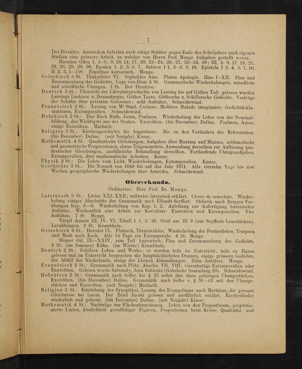 Der Direktor. Ausserdem lieferten noch einige Schüler gegen Ende des Schuljahres nach eigenen Studien eine grössere Arbeit, zu welcher von Herrn Prof. Menge Aufgaben gestellt waren.