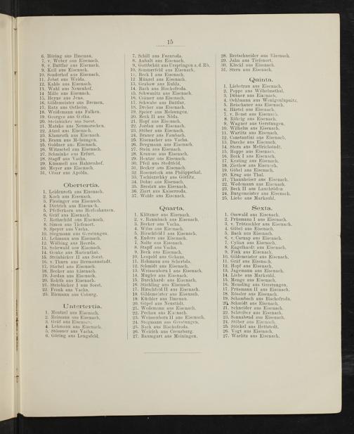 Quanta. Klötzner aus Eisenach. . v. Baumbach aus Eisenach. Becker aus Vacha. Wilss aus Eisenach. . Hirschfeld l aus Eisenach. Enders aus Eisenach. .Nolte aus Eisenach. . Stapff aus Vacha. . Beck aus Eisenach. Leopold aus Gehaus. Hohmann aus Scherbda. . Schmidt aus Eisenach. Weissenborn I aus Eisenach. 14. Mugler aus Eisenach. 15. Burckhard aus Eisenach. 16. Stichling aus Eisenach. 17. Hirschfeld II aus Eisenach. 18. Gildemeister aus Eisenach. 19. Küchler aus Ilmenau. 20. Göpel aus Neustädt. 21. Wedemann aus Eisenach. 22. Pechau aus Eisenach. 23. Weissenborn II aus Eisenach. 24. Stegmann aus Gerstungen. 25. Bach aus Bischofroda. 26. Weirich aus Creuzburg. 27. Baumgart aus Meiningen.