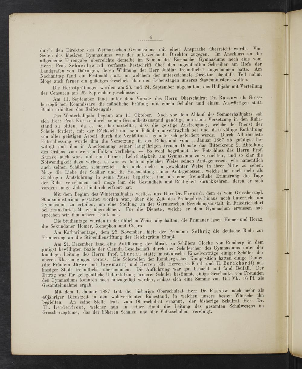 Mit dem 1. Januar 1887 trat der bisherige Oberschulrat Herr Dr. Rassow nach mehr als 40jähriger Dienstzeit in den wohlverdienten Ruhestand, in welchen unsere besten Wünsche ihn begleiten. An seine Stelle trat, zum Oberschulrat ernannt, der bisherige Schulrat, Herr Dr. Th. Leidenfrost, welcher nun in seiner Hand die Leitung des gesamten Schulwesens im Grossherzogtume, das der höheren Schulen und der Volksschulen, vereinigt.