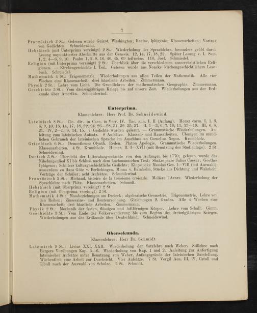 Lateinisch 9 St.: Livius XXI, XXII. Wiederholung der Satzlehre nach Weber. Stillehre nach Bergers Vorübungen Kap. 3— 6. Wiederholung von Kap. 1 und 2. Anleitung zur Anfertigung lateinischer Aufsätze unter Benutzung von Weber, Anfangsgründe der lateinischen Darstellung. Wöchentlich eine Arbeit zur Durchsicht. Vier Aufsätze. 7 St. Vergil Aen. III, IV, Catull und Tibull nach der Auswahl von Schulze. 2 St. Schmicdt.