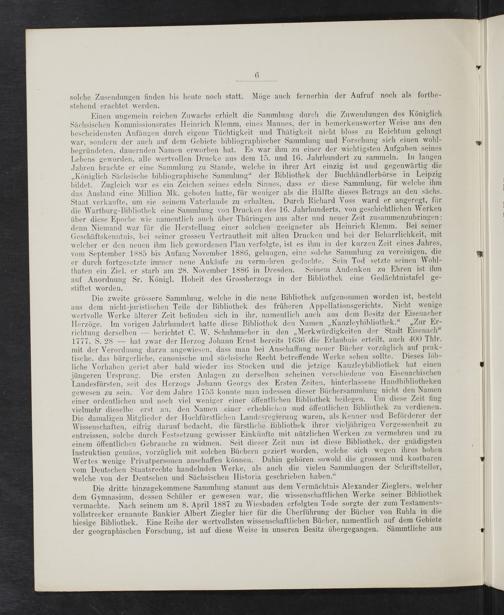 Einen ungemein reichen Zuwachs erhielt die Sammlung durch die Zuwendungen des Königlich Sächsischen Kommissionsrates Heinrich Klemm, eines Mannes, der in bemerkenswerter Weise aus den bescheidensten Anfängen durch eigene Tüchtigkeit und Thätigkeit nicht bloss zu Reichtum gelangt war, sondern der auch auf dem Gebiete bibliographischer Sammlung und Forschung sich einen wohl- begründeten, dauernden Namen erworben hat. Es war ihm zu einer der wichtigsten Aufgaben seines Lebens geworden, alle wertvollen Drucke aus dem 15. und 16. Jahrhundert zu sammeln. In langen Jahren brachte er eine Sammlung zu Stande, welche in ihrer Art einzig ist und gegenwärtig die „Königlich Sächsische bibliographische Sammlung“ der Bibliothek der Buchhändlerbörse in Leipzig bildet. Zugleich war es ein Zeichen seines edeln Sinnes, dass er diese Sammlung, für welche ihm das Ausland eine Million Mk. geboten hatte, für weniger als die Hälfte dieses Betrags an den sächs. Staat verkaufte, um sie seinem Vaterlande zu erhalten. Durch Richard Voss ward er angeregt, für die Wartburg-Bibliothek eine Sammlung von Drucken des 16. Jahrhunderts, von geschichtlichen Werken über diese Epoche wie namentlich auch über Thüringen aus alter und neuer Zeit zusammenzubringen: denn Niemand war für die Herstellung einer solchen geeigneter als Heinrich Klemm. Bei seiner Geschäftskenntnis, bei seiner grossen Vertrautheit mit alten Drucken und bei der Beharrlichkeit, mit welcher er den neuen ihm lieb gewordenen Plan verfolgte, ist es ihm in der kurzen LZeit eines Jahres, vom September 1885 bis Anfang November 1886, gelungen, eine solche Sammlung zu vereinigen, die er durch fortgesetzte immer neue Ankäufe zu vermehren gedachte. Sein Tod setzte seinen Wohl- thaten ein Ziel, er starb am 28. November 1886 in Dresden. Seinem Andenken zu Ehren ist ihm auf Anordnung Sr. Königl. Hoheit des Grossherzogs in der Bibliothek eine Gedächtnistafel ge- stiftet worden.