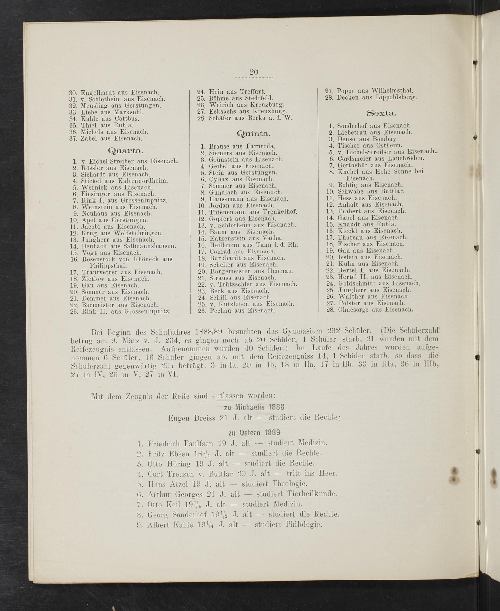 20 30. Engelhardt aus Eisenach. 24. Hein aus Treffurt. 27. Poppe aus Wilhelmsthal. 31. v. Schlotheim aus Eisenach. 25. Böhme aus Stedtfeld. 28. Decken aus Lippoldsberg. 32. Meusling aus Gerstungen. 26. Weirich aus Kreuzburg. 33 Liebe aus Marksuhl. 27. Ecksachs aus Kreuzburg. Sexta 34. Kahle aus Cottbus. 28. Schäfer aus Berka a. d. W. 25 7.— 2 35. Aüied As Ruhla. 1. Sonderhof aus Eisenach. 36. Michels aus Eisenach. Quinta. 2. Liebetrau aus Eisenach. 37. Zabel aus Eisenach. 3. Denso aus Bombay . Brause aus Farnroda. 4. Tischer aus Ostheim. uarta. Liemers aus lisenac 5 Si Itreiber aus Eis G. Siemers aus Eisenach. 5. v. Eichel-Streiber aus Eisenach-