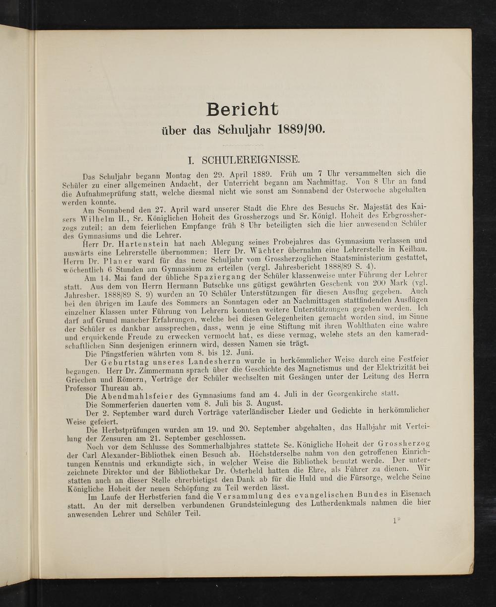 Ilerr Dr. Hartenstein hat nach Ablegung seines Probejahres das Gymnasium verlassen und auswärts eine Lehrerstelle übernommen; Herr Dr. Wächter übernahm eine Lehrerstelle in Keilhau. Ierrn Dr. Plamer ward für das neue Schuljahr vom Grossherzoglichen Staatsministerium gestattet, wöchentlich 6 Stunden am Gymnasium zu erteilen(vergl. Jahresbericht 1888/89 S. 4).