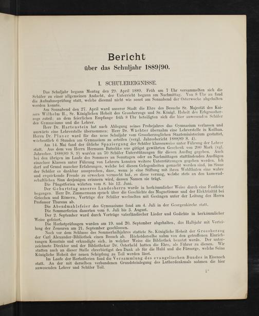 Noch vor dem Schlusse des Sommerhalbjahres stattete Se. Königliche Hoheit der Grossherzog der Carl Alexander-Bibliothek einen Besuch ab. Höchstderselbe nahm von den getroffenen Einrich- tungen Kenntnis und erkundigte sich, in welcher Weise die Bibliothek benutzt werde. Der unter- zeichnete Direktor und der Bibliothekar Dr. Osterheld hatten die Ehre, als Führer zu dienen. Wir statten auch an dieser Stelle ehrerbietigst den Dank ab für die Huld und die Fürsorge, welche Seine Königliche Hoheit der neuen Schöpfung zu Teil werden lässt.