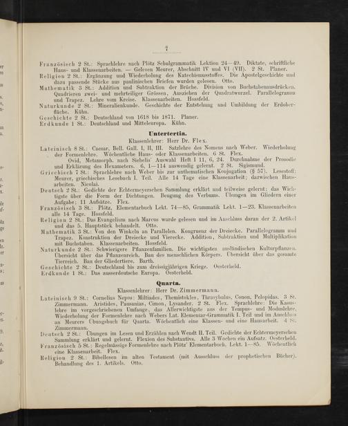 Lateinisch 9 St.: Cornelius Nepos: Miltiades, Themistokles, Thrasybulus, Conon, Pelopidas. 3 St. Zimmermann. Aristides, Pausanias, Cimon, Lysander. 2 St. Flex. Sprachlehre: Die Kasus- lehre im vorgeschriebenen Umfange, das Allerwichtigste aus der Tempus- und Moduslehre, Wiederholung der Formenlehre nach Webers Lat. Elementar-Grammatik I. Teil und im Anschluss an Meurers Übungsbuch für Quarta. Wöchentlich eine Klassen- und eine Hausarbeit. 4 St. Zimmermann.