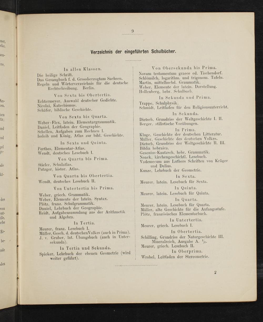 re, In allen Klassen. Von Obersekunda bis Prima. Die heilige Schrift. Novum testamentum graece ed. Tischendorf. Das Gesanghuch f. d. Grossherzogtum Sachsen. Scchlömilch, logarithm. und trigonom. Tafeln. 8 Regeln und Wörterverzeichnis für die deutsche Martin, mittelhochd. Grammatik. Rechtschreibung. Berlin. Weber, Elemente der latein. Darstellung. — Hlollenberg, hebr. Schulbuch. Sexta bis Obertertia. 3 5 4 1Dn Se 3 e ie tan In Sekunda und Prima. Al- Echtermeyer, Auswahl deutscher Gedichte.. teen. Nicolai, Katechismus. Trappe, Schulphysik. Schäfer, biblische Geschichte. Schmidt, Leitfaden für den Religionsunterricht. hen Ge de be Von Sexta bis Quarta. Viisale Eeraerr enrle mjeher.. I Le 5—.—. etscl). 14. riss 8 J esc— 2 1 3 Weber-Flex, latein. Elementargrammatik. V ic1S. f1 deeeles hee 3 tgesc chte 8 Daniel, Leittaden der Geographie. Berger, stilistische Vorübungen. Schellen, Aufgaben zum Rechnen I. V In Prima. Issleib und König, Atlas zur bibl. Geschichte. Kluge, Geschichte der deutschen Litteratur. nd u 3 3 2 In S I Cyuint Müller, Geschichte des deutschen Volkes. 2 6 n Sexta und Quinta. Dietsch, Grundriss der Weltgeschichte II. III. gel— 3 8 3 Perthes, Elementar-Atlas. Biblia hebraica.
