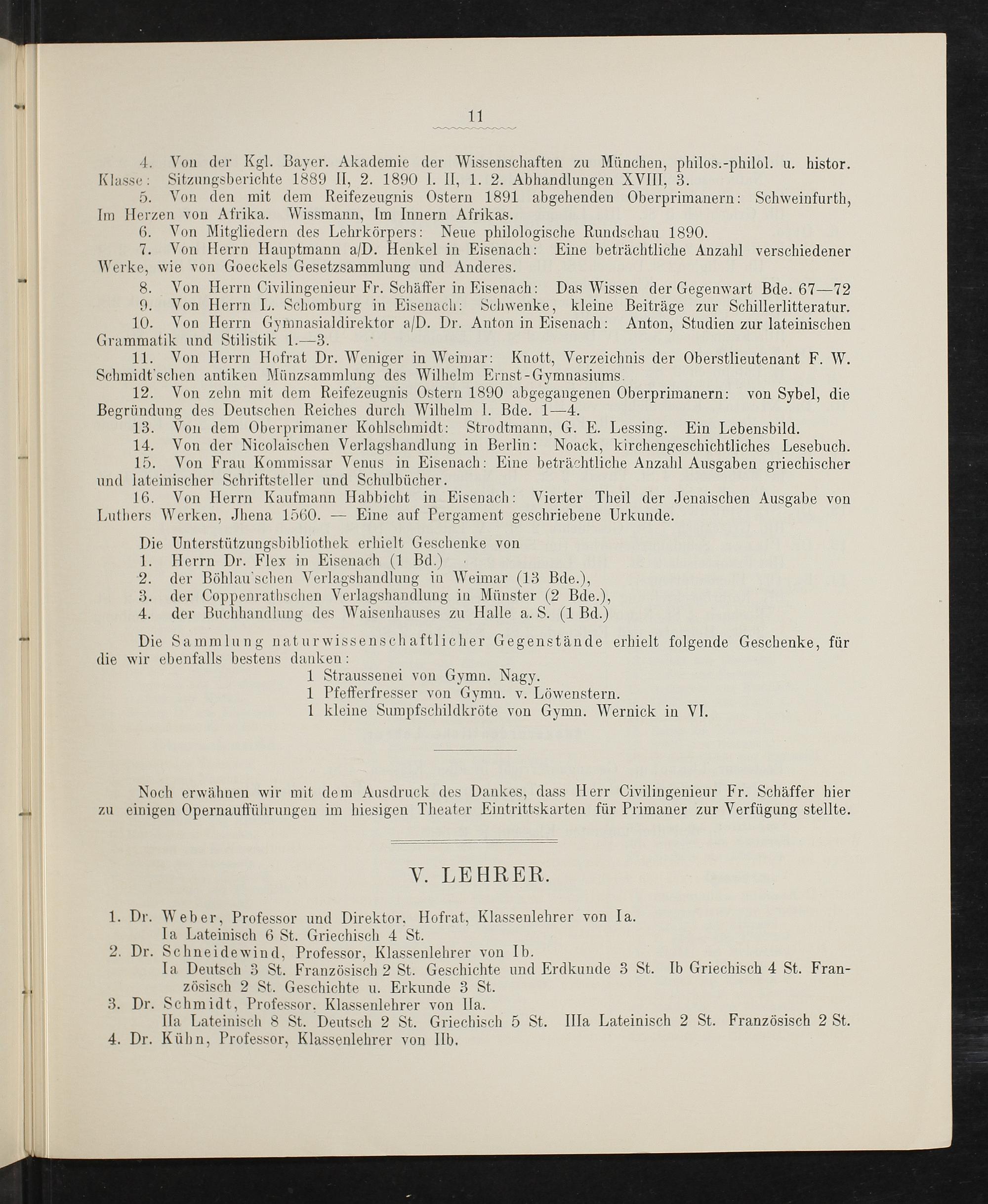 — Die Sammlung naturwissenschaftlicher Gegenstände erbielt folgende Geschenke, für die wir ebenfalls bestens danken: 1 Straussenei von Gymn. Nagy. 1 Pfefferfresser von Gymn. v. Löwenstern. 1 kleine Sumpfschildkröte von Gymn. Wernick in VI. Noch erwähnen wir mit dem Ausdruck des Dankes, dass Herr Civilingenieur Fr. Schäffer hier 2 zu einigen Opernaufführungen im hiesigen Theater Eintrittskarten für Primaner zur Verfügung stellte. V. LE ER ER. 1. Dr. Weber, Professor und Direktor. Hofrat, Klassenlehrer von Ia. Ia Lateinisch 6 St. Griechisch 4 St. 2. Dr. Schneidewind, Professor, Klassenlehrer von Ib. la Deutsch 3 St. Französisch 2 St. Geschichte und Erdkunde 3 St. Ib Griechisch 4 St. Fran- 4 zösisch 2 St. Geschichte u. Erkunde 3 St.