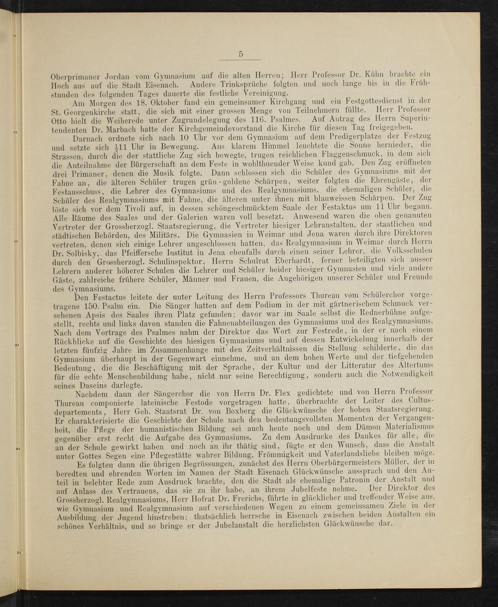 Es folgten dann die übrigen Begrüssungen, zunächst des Herrn. Oberbürgermeisters Müller, der in beredten und ehrenden Worten im Namen der Stadt Eisenach Glückwünsche aussprach und den An- teil in belebter Rede zum Ausdruck brachte, den die Stadt als ehemalige Patronin der Anstalt und auf Anlass des Vertrauens, das sie zu ihr habe, an ihrem Jubelfeste nehme. Der Direktor des Grossherzogl. Realgymnasiums, Herr Hofrat Dr. Frerichs, führte in glücklicher und treffender Weise aus, wie Gymnasium und Realgymnasium auf verschiedenen Wegen zu einem gemeinsamen Ziele in der Ausbildung der Jugend hinstreben; thatsächlich herrsche in Eisenach zwischen beiden Anstalten ein schönes Verhältnis, und so bringe er der Jubelaustalt die herzlichsten Glückwünsche dar.