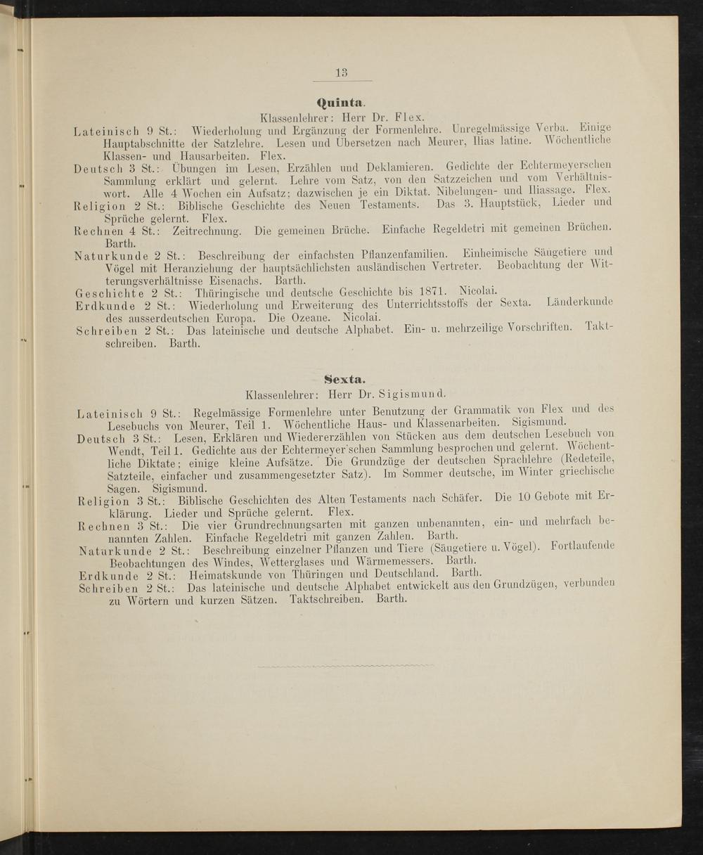 13 Quinta. Klassenlehrer: Herr Dr. Flex. Lateinisch 9 St.: Wiederholung und Ergänzung der Formenlehre. Unregelmässige Verba. Einige