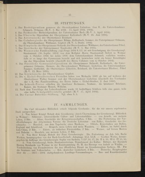 8. Die Wienersche Familienstiftung(vgl. Progr. 1894 S. 11) ist mit Genehmigung des Grossherzogl. Staatsminist.(30. Septbr. 1894) von dem Kollator Herrn Staatsanwalt Siefert in Weimar vom 1. Oktober 1894 bis dahin 1896 dem Untersekundaner Schmuck verliehen worden, falls er so lange das Gymnasium besucht und sich inzwischen nicht ein besser Berechtigter um das Stipendium bewirbt(Zuschrift des Herrn Collators vom 4. Oktober 1894).