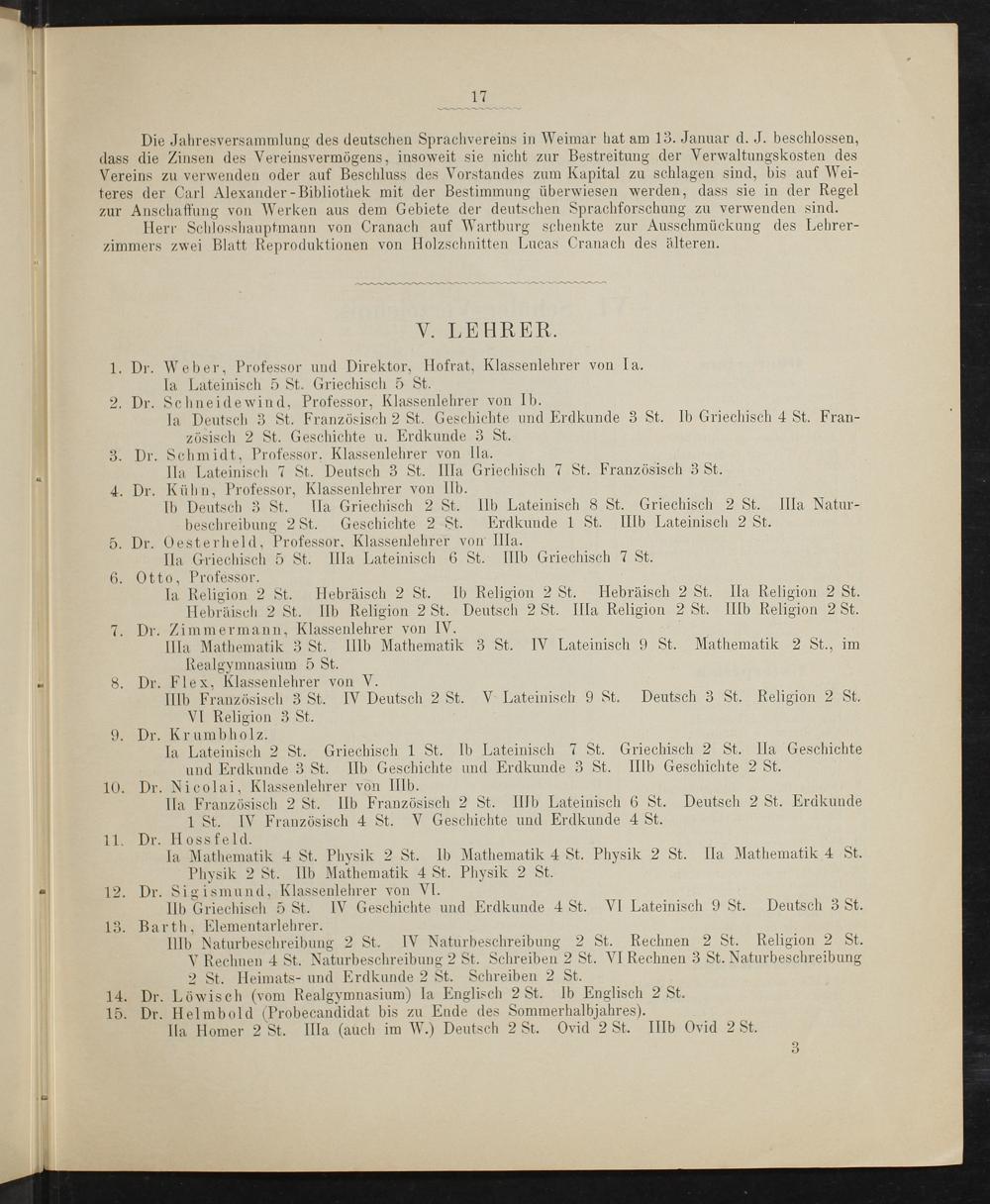 1. Dr. Weber, Professor und Direktor, Hofrat, Klassenlehrer von Ia. la Lateinisch 5 St. Griechisch 5 St. 2. Dr. Schneidewind, Professor, Klassenlehrer von Ib. la Deutsch 3 St. Französisch 2 St. Geschichte und Erdkunde 3 St. Ib Griechisch 4 St. Fran- zösisch 2 St. Geschichte u. Erdkunde 3 St. 3. Dr. Schmidt, Professor. Klassenlehrer von Ila. Ila Lateinisch 7 St. Deutsch 3 St. IIla Griechisch 7 St. Französisch 3 St. 4. Dr. Kühn, Professor, Klassenlehrer von IIb. Ib Deutsch 3 St. Ila Griechisch 2 St. IIb Lateinisch 8 St. Griechisch 2 St. IIla Natur- beschreibung 2 St. Geschichte 2 St. Erdkunde 1 St. IIIb Lateinisch 2 St. 5. Dr. Oesterheld, Professor. Klassenlehrer von IIIa. Ila Griechisch 5 St. IIIa Lateinisch 6 St. IIIb Griechisch 7 S 6. Otto, Professor. la Religion 2 St. Hebräisch 2 St. Ib Religion 2 St. Hebräisch 2 St. Ila Religion 2 St. Hebräisch 2 St. IIb Religion 2 St. Deutsch 2 St. IIla Religion 2 St. IIIb Religion 2 St. Dr. Zimmermann, Klassenlehrer von IV. IIla Mathematik 3 St. IIIb Mathematik 3 St. IV Lateinisch 9 St. Mathematik 2 St., im Realgymnasium 5 St. — 8. Dr. Flex, Klassenlehrer von V. IIIb Französisch 3 St. IV Deutsch 2 St. V Lateinisch 9 St. Deutsch 3 St. Religion 2 St. VI Religion 3 St. 9. Dr. Krumbh olz. Ia Lateinisch 2 St. Griechisch 1 St. Ib Lateinisch 7 St. Griechisch 2 St. Ila Geschichte und Erdkunde 3 St. IIb Geschichte und Erdkunde 3 St. IIIb Geschichte 2 St. 10. Dr. Nicolai, Klassenlehrer von IIIb. Ila Französisch 2 St. IIb Französisch 2 St. IIIb Lateinisch 6 St. Deutsch 2 St. Erdkunde 1 St. IV Französisch 4 St. V Geschichte und Erdkunde 4 St. 11. Dr. Hossfeld. la Mathematik 4 St. Physik 2 St. Ib Mathematik 4 St. Physik 2 St. Ila Mathematik 4 St. Physik 2 St. IIb Mathematik 4 St. Physik 2 St. * 12. Dr. Sigismund, Klassenlehrer von VI. IIb Griechisch 5 St. IV Geschichte und Erdkunde 4 St. VI Lateinisch 9 St. Deutsch 3 St. 13. Barth, Elementarlehrer. IIIb Naturbeschreibung 2 St. IV Naturbeschreibung 2 St. Rechnen 2 St. Religion 2 St. V Rechnen 4 St. Naturbeschreibung 2 St. Schreiben 2 St. VI Rechnen 3 St. Naturbeschrei bung 2 St. Heimats- und Erdkunde 2 St. Schreiben 2 St. 14. Dr. Löwisch(vom Realgymnasium) la Englisch 2 St. Ib Englisch 2 St. 15. Dr. Helm bold Eroheranlilat bis zu Ende des Sommerhalbjahres). Ila Homer 2 St. IIIa(auch im W.) Deutsch 2 St. Ovid 2 St. IIIb Ovid 2 St.