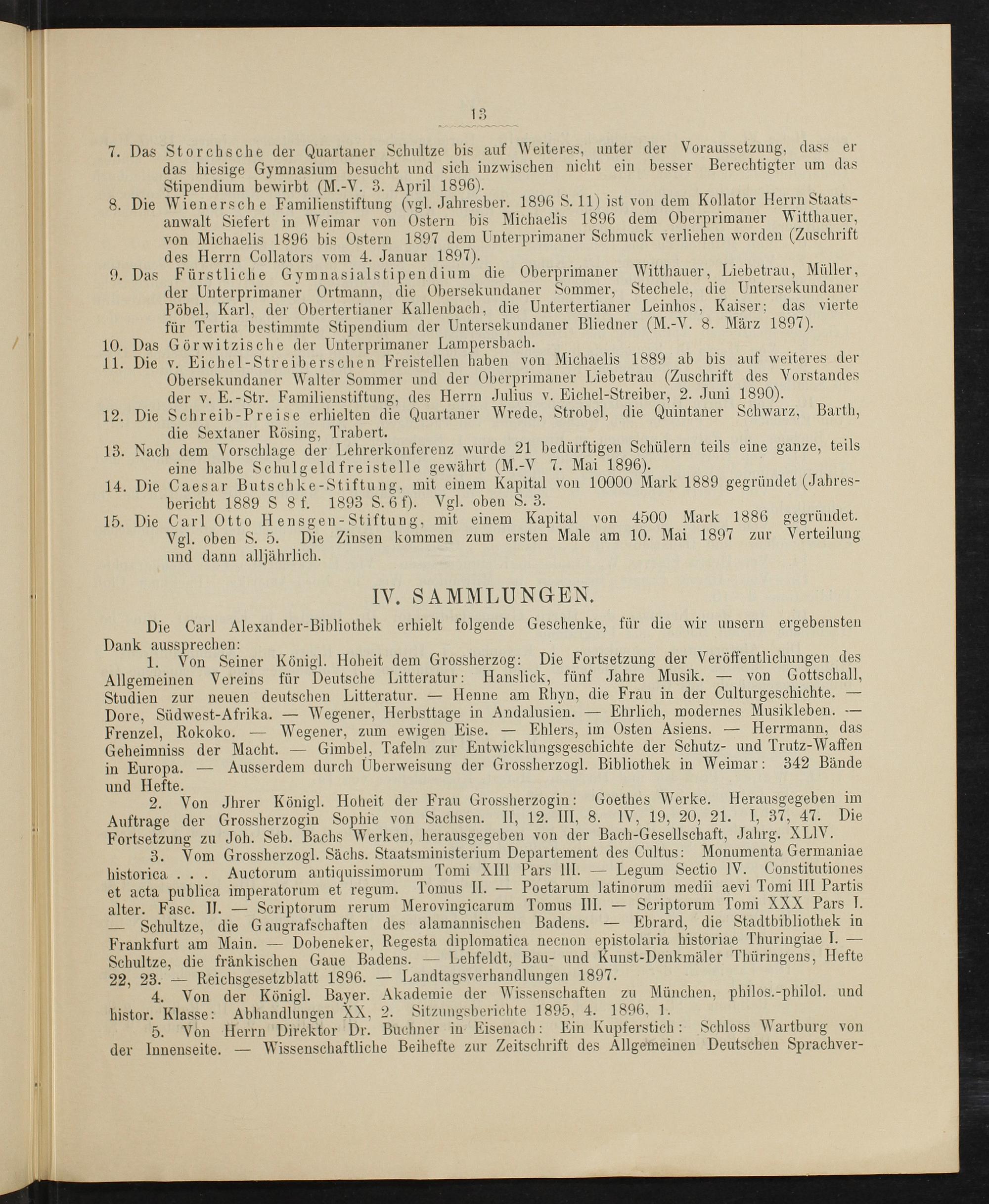 8. Die Wienersche Familienstiftung(vgl. Jahresber. 1896 S. 11) ist von dem Kollator Herrn Staats- anwalt Siefert in Weimar von Ostern bis Michaelis 1896 dem Oberprimaner Mitthauer, von Michaelis 1896 bis Ostern 1897 dem Unterprimaner Schmuck verliehen worden(Zuschrift, des Herrn Collators vom 4. Januar 1897).