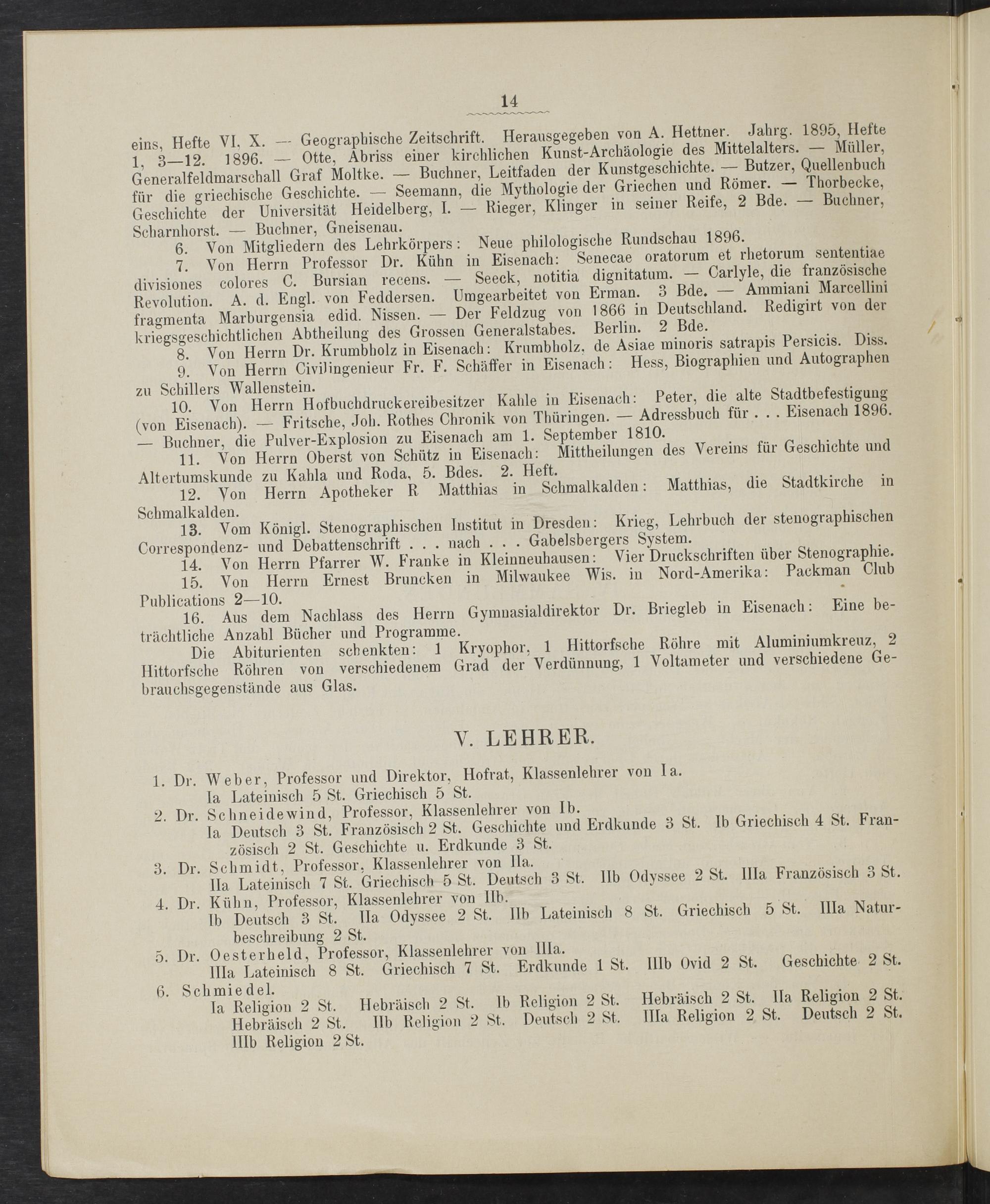 1. Dr. Weber, Professor und Direktor, Hofrat, Klassenlehrer von Ia. la Lateinisch 5 St. Griechisch 5 St. 2. Dr. Schneidewind, Professor, Klassenlehrer von Ib. la Deutsch 3 St. Französisch 2 St. Geschichte und Erdkunde 3 St. Ib Griechisch 4 St. Fran- zösisch 2 St. Geschichte u. Erdkunde 3 St. 3. Dr. Schmidt, Professor, Klassenlehrer von Ila. Ila Lateinisch 7 St. Griechisch 5 St. Deutsch 3 St. IIb Odyssee 2 St. IIla Französisch 3 St. 4. Dr. Kühn, Professor, Klassenlehrer von IIb. Ib Deutsch 3 St. lIla Odyssee 2 St. IIb Lateinisch 8 St. Griechisch 5 St. IIIa Natur- beschreibung 2 St. 5. Dr. Oesterheld, Professor, Klassenlehrer von IIIa. IIla Lateinisch 8 St. Griechisch 7 St. Erdkunde 1 St. IIlb Ovid 2 St. Geschichte 2 St. Schmiedel. la Religion 2 St. Hebraäisch 2 St. Ib Religion 2 St. Hebräisch 2 St. Ila Religion 2 St. Hebräisch 2 St. IIb Religion 2 St. Deutsch 2 St. IIla Religion 2 St. Deutsch 2 St. IIIb Religion 2 St.