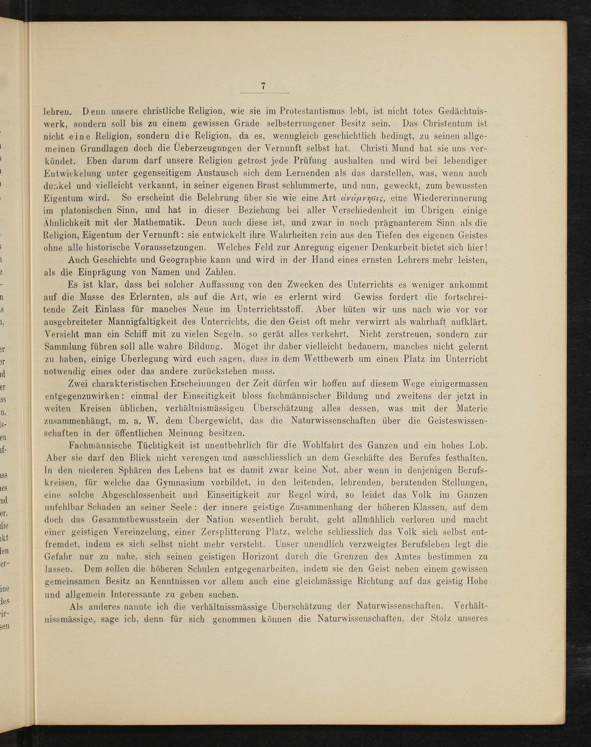 Es ist klar, dass bei solcher Auffassung von den Zwecken des Unterrichts es weniger ankommt auf die Masse des Erlernten, als auf die Art, wie es erlernt wird. Gewiss fordert die fortschrei- tende Zeit Einlass für manches Neue im Unterrichtsstoff. Aber hüten wir uns nach wie vor vor ausgebreiteter Mannigfaltigkeit des Unterrichts, die den Geist oft mehr verwirrt als wahrhaft aufklärt. Versieht man ein Schiff mit zu vielen Segeln, so gerät alles verkehrt. Nicht zerstreuen, sondern zur Sammlung führen soll alle wahre Bildung. Möget ihr daher vielleicht bedauern, manches nicht gelernt, zu haben, einige UÜberlegung wird euch sagen, dass in dem Wettbewerb um einen Platz im Unterricht notwendig eines oder das andere zurückstehen muss.
