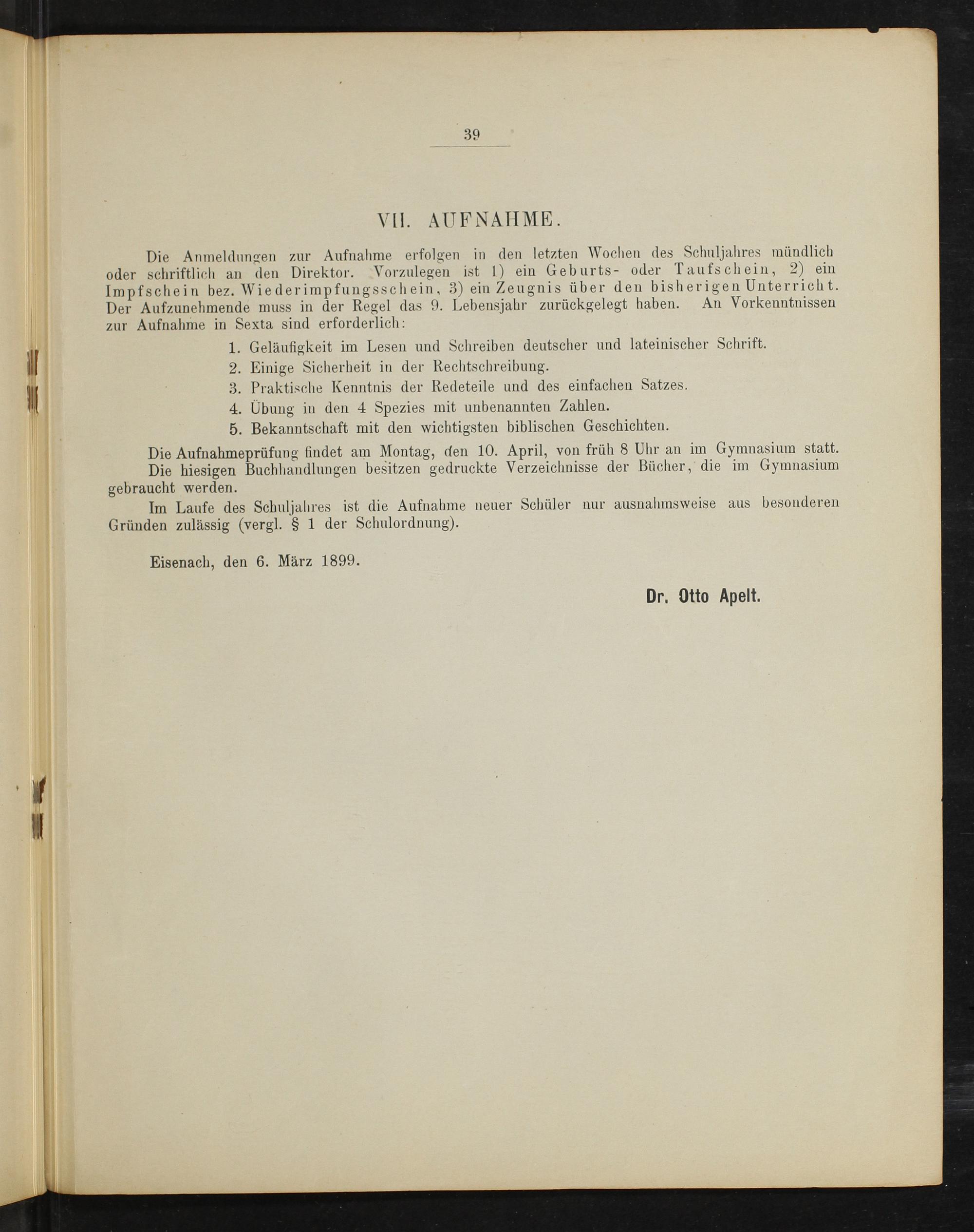 Die Aufnahmeprüfung findet am Montag, den 10. April, von früh 8 Uhr an im Gymnasium statt. Die hiesigen Buchhandlungen besitzen gedruckte Verzeichnisse der Bücher, die im Gymnasium gebraucht werden.