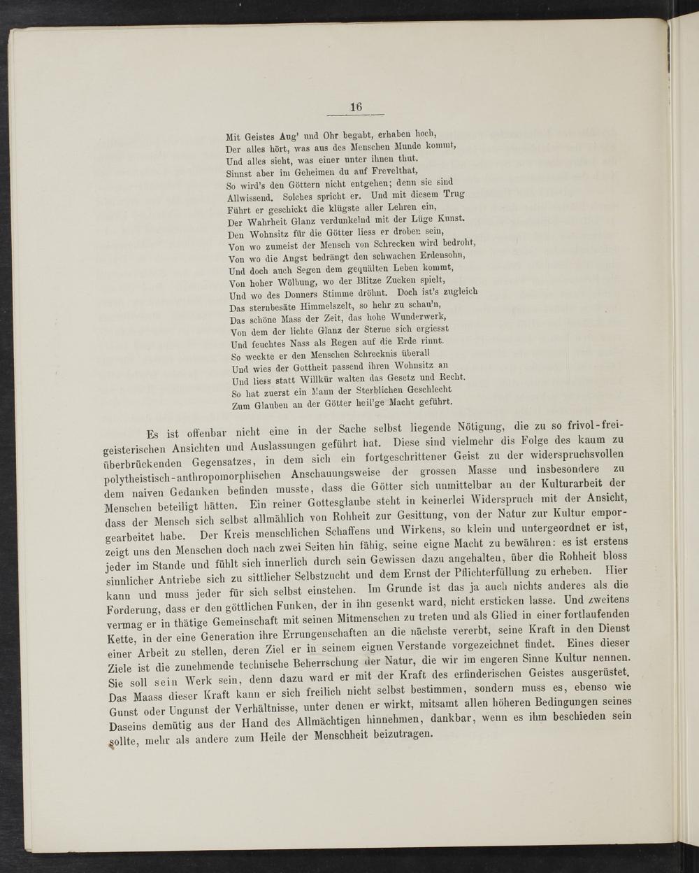 Es ist offenbar nicht eine in der Sache selbst liegende Nötigung, die zu so frivol-frei- geisterischen Ansichten und Auslassungen geführt hat. Diese sind vielmehr dis Folge des kaum zu überbrückenden Gegensatzes, in dem sich ein fortgeschrittener Geist zu der widerspruchsvollen polytheistisch-anthropomorphischen Anschauungsweise der grossen Masse und insbesondere zu dem naiven Gedanken befinden musste, dass die Götter sich unmittelbar an der Kulturarbeit der Menschen beteiligt hätten. Ein reiner Gottesglaube steht in keinerlei Widerspruch mit der Ansicht, dass der Mensch sich selbst allmählich von Rohheit zur Gesittung, von der Natur zur Kultur empor- gearbeitet habe. Der Kreis menschlichen Schaffens und Wirkens, so klein und untergeordnet er ist, zeigt uns den Menschen doch nach zwei Seiten hin fähig, seine eigne Macht zu bewähren: es ist erstens jeder im Stande und fühlt sich innerlich durch sein Gewissen dazu angehalten, über die Rohheit bloss sinnlicher Antriebe sich zu sittlicher Selbstzucht und dem Ernst der Pflichterfüllung zu erheben. Hier kann und muss jeder für sich selbst einstehen. Im Grunde ist das ja auch nichts anderes als die Forderung, dass er den göttlichen Funken, der in ihn gesenkt ward, nicht ersticken lasse. Und zweitens vermag er in thätige Gemeinschaft mit seinen Mitmenschen zu treten und als Glied in einer fortlaufenden Kette, in der eine Generation ihre Errungenschaften an die nächste vererbt, seine Kraft in den Dienst einer Arbeit zu stellen, deren Ziel er in seinem eignen Verstande vorgezeichnet findet. Eines dieser Ziele ist die zunehmende technische Beherrschung der Natur, die wir im engeren Sinne Kultur nennen. Sie soll sein Werk sein, denn dazu ward er mit der Kraft des erfinderischen Geistes ausgerüstet. Das Maass dieser Kraft kann er sich freilich nicht selbst bestimmen, sondern muss es, ebenso wie Gunst oder Ungunst der Verhältnisse, unter denen er wirkt, mitsamt allen höheren Bedingungen seines Daseins demütig aus der Hand des Allmächtigen hinnehmen, dankbar, wenn es ihm beschieden sein sollte, mehr als andere zum Heile der Menschheit beizutragen.