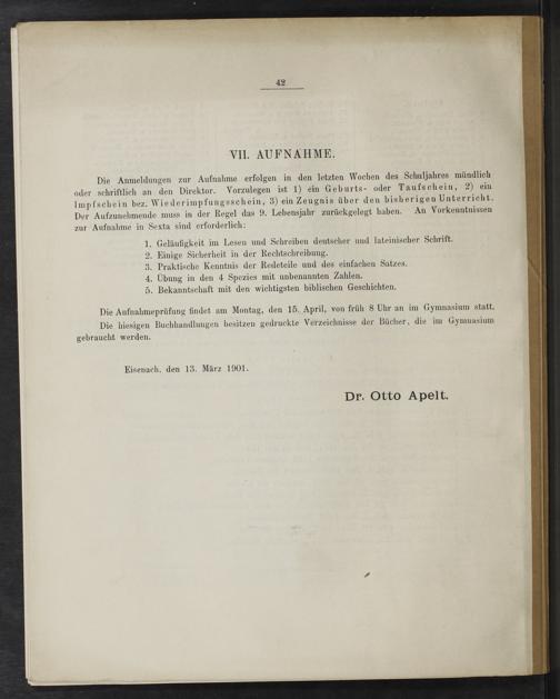 Die Anmeldungen zur Aufnahme erfolgen in den letzten Wochen des Schuljahres mündlich oder schriftlich an den Direktor. Vorzulegen ist 1) ein Geburts- oder Taufschein, 2) ein Impfschein bez. Wiederimpfungsschein, 3) ein Zeugnis über den bisherigen Unterricht. Der Aufzunehmende muss in der Regel das 9. Lebensjahr zurückgelegt haben. An Vorkenntnissen zur Aufnahme in Sexta sind erforderlich: