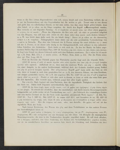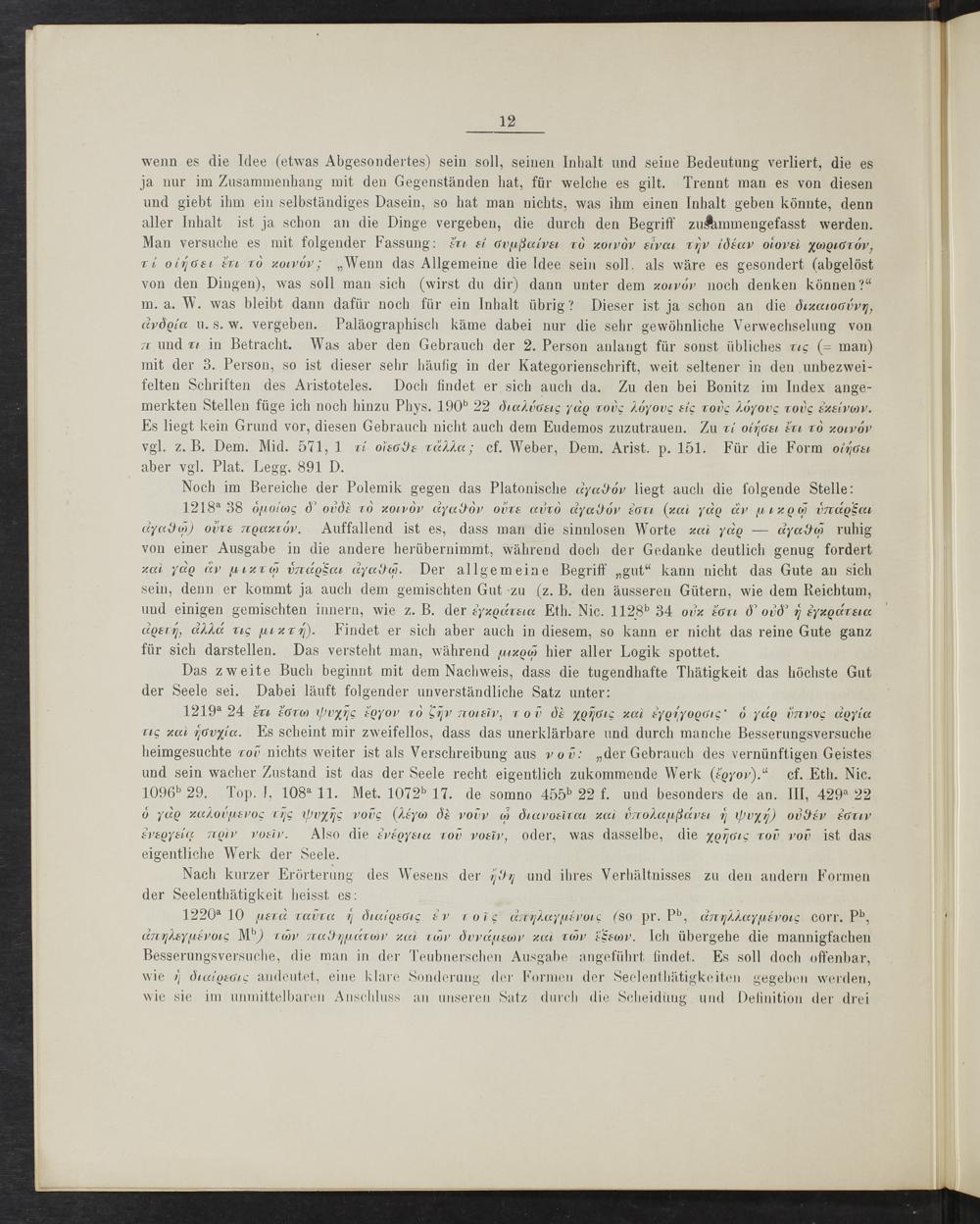1219* 24 Z1ν ꝙεκσ υνm sτων τ ν τπεεν, το IOrGαι τα ν̈ριmχνν—j⁴εο οπνοε deyia 1ε Ʒν‿υωα. Es scheint mir zweifellos, dass das unerklärbare und durch manche Besserungsversuche heimgesuchte z⁰ν nichts weiter ist als Verschreibung aus»oëν:„der Gebrauch des vernünftigen Geistes und sein wacher Zustand ist das der Seele recht eigentlich zukommende Werk(ο„άαο).“ cf. Eth. Nic. 1096 ⁵ 29. Top. I, 108² 11. Met. 1072 5 17. de somno 455 22 f. und besonders de an. III, 429 22 d/ ναοωυmνυν̈᷑ νοεσ ν̈ᷣ xsõs voëc(Aeν voν ιᷣemνοsτe eui rolusdvε 0wVfboxc) 0596ν SGrνν uoysic Oiν vosin. Also die svéorεα το vosin, oder, was dasselbe, die„ονwbw/wroë„oũ ist das eigentliche Werk der Seele.