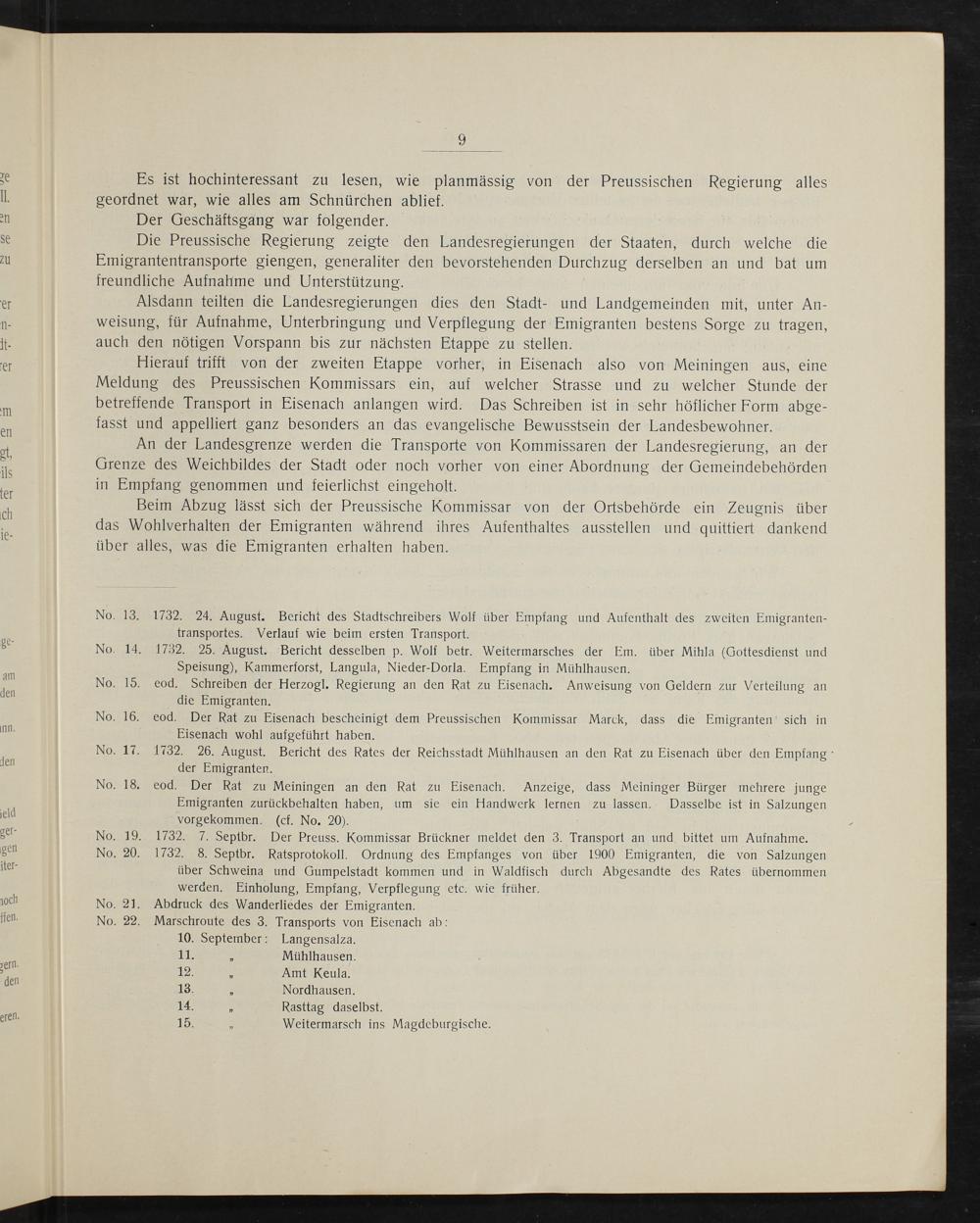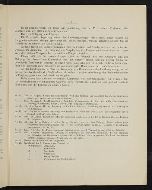 No. 20. 1732. 8. Septbr. Ratsprotokoll. Ordnung des Empfanges von über 1900 Emigranten, die von Salzungen über Schweina und Gumpelstadt kommen und in Waldfisch durch Abgesandte des Rates übernommen werden. Einholung, Empfang, Verpflegung etc. wie früher.