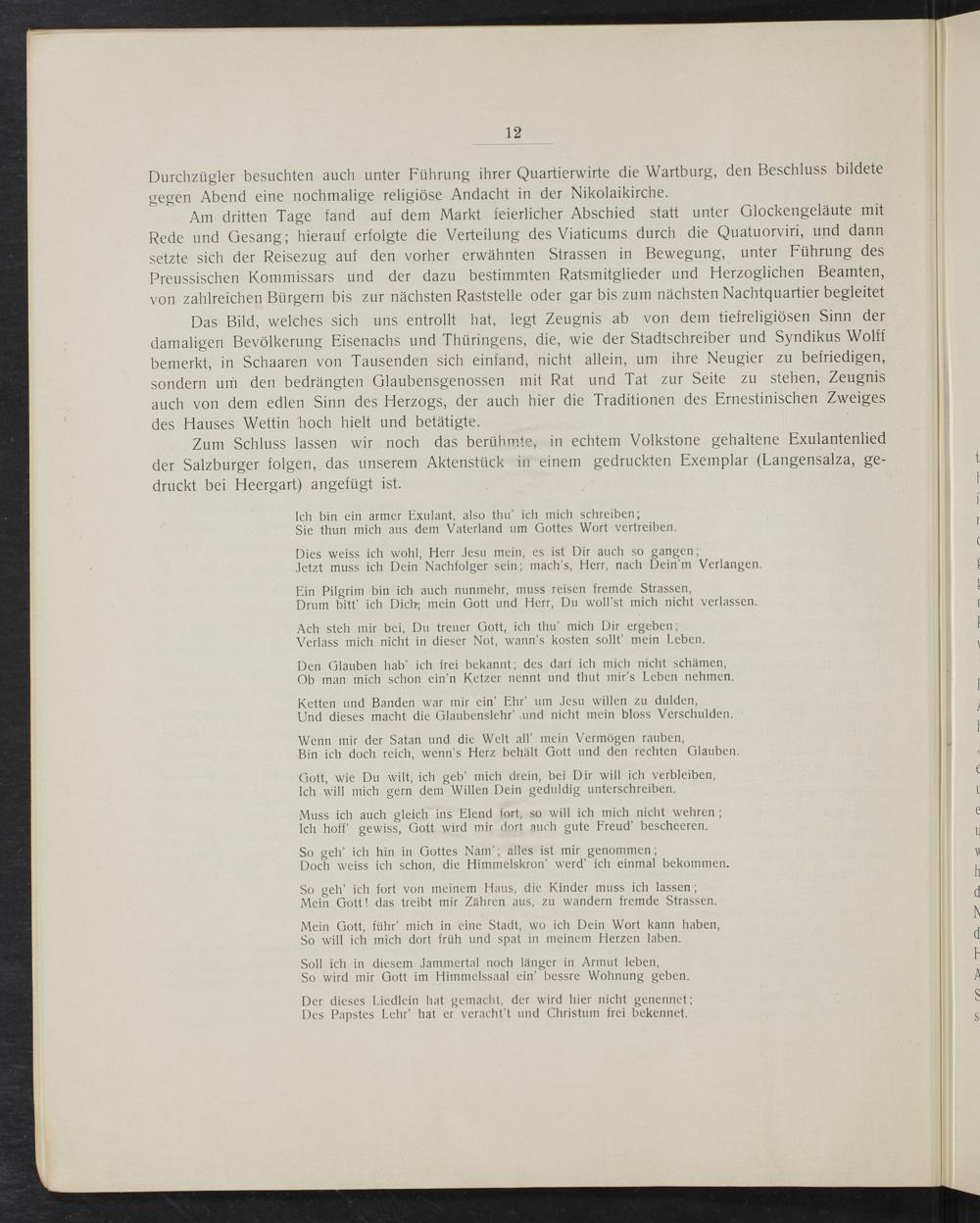 Zum Schluss lassen wir noch das berühmte, in echtem Volkstone gehaltene Exulantenlied der Salzburger folgen, das unserem Aktenstück in einem gedruckten Exemplar(Langensalza, ge- druckt bei Heergart) angefügt ist.