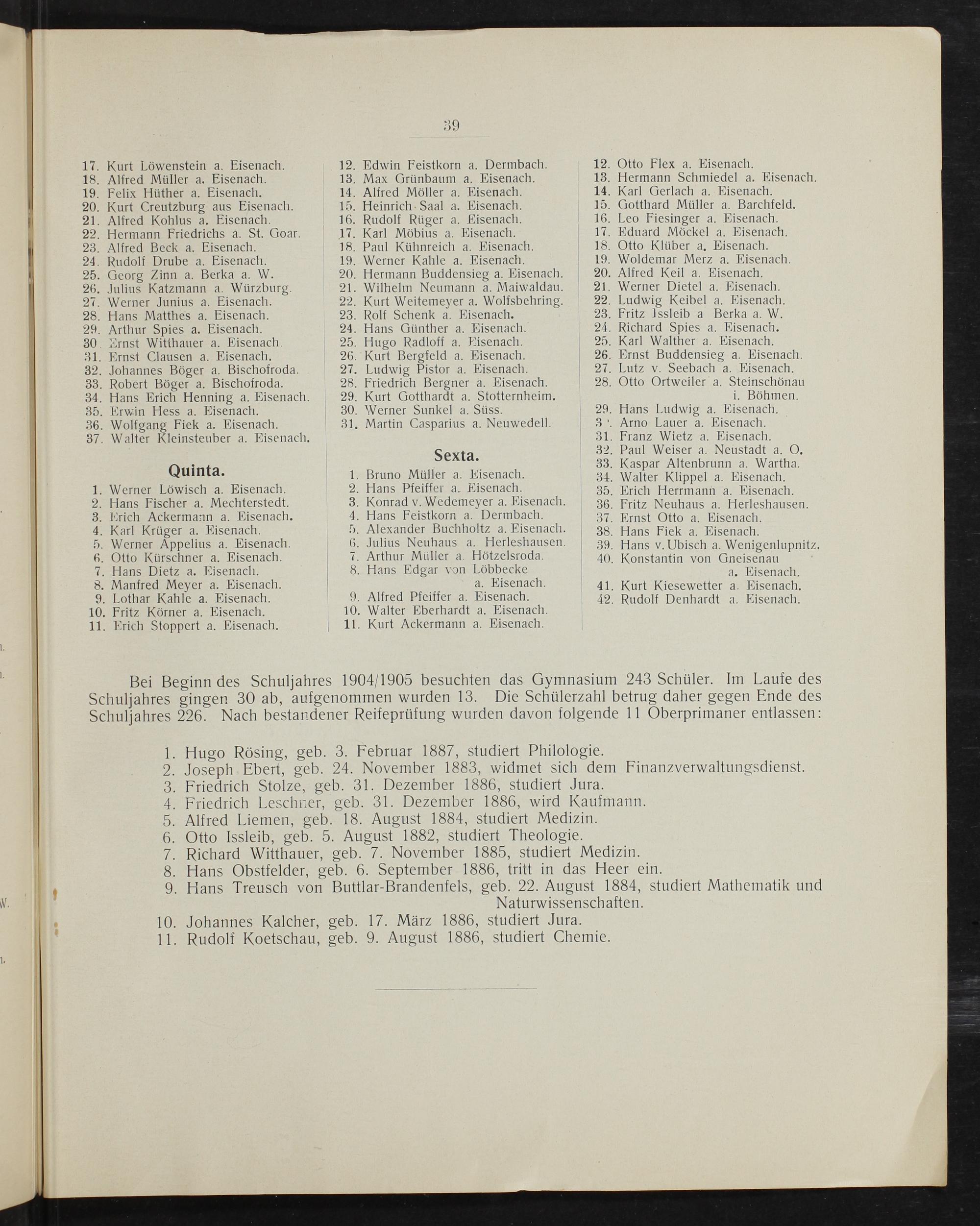 6. Otto Issleib, geb. 5. August 1882, studiert Theologie. 7. Richard Witthauer, geb. 7. November 1885, studiert Medizin. 8. Hans Obstfelder, geb. 6. September 1886, tritt in das Heer ein. 9. Hans Treusch von Buttlar-Brandenfels, geb. 22. August 1884, studiert Mathematik und N. Naturwissenschaften. . 10. Johannes Kalcher, geb. 17. März 1886, studiert Jura. 11. Rudolf Koetschau, geb. 9. August 1886, studiert Chemie.