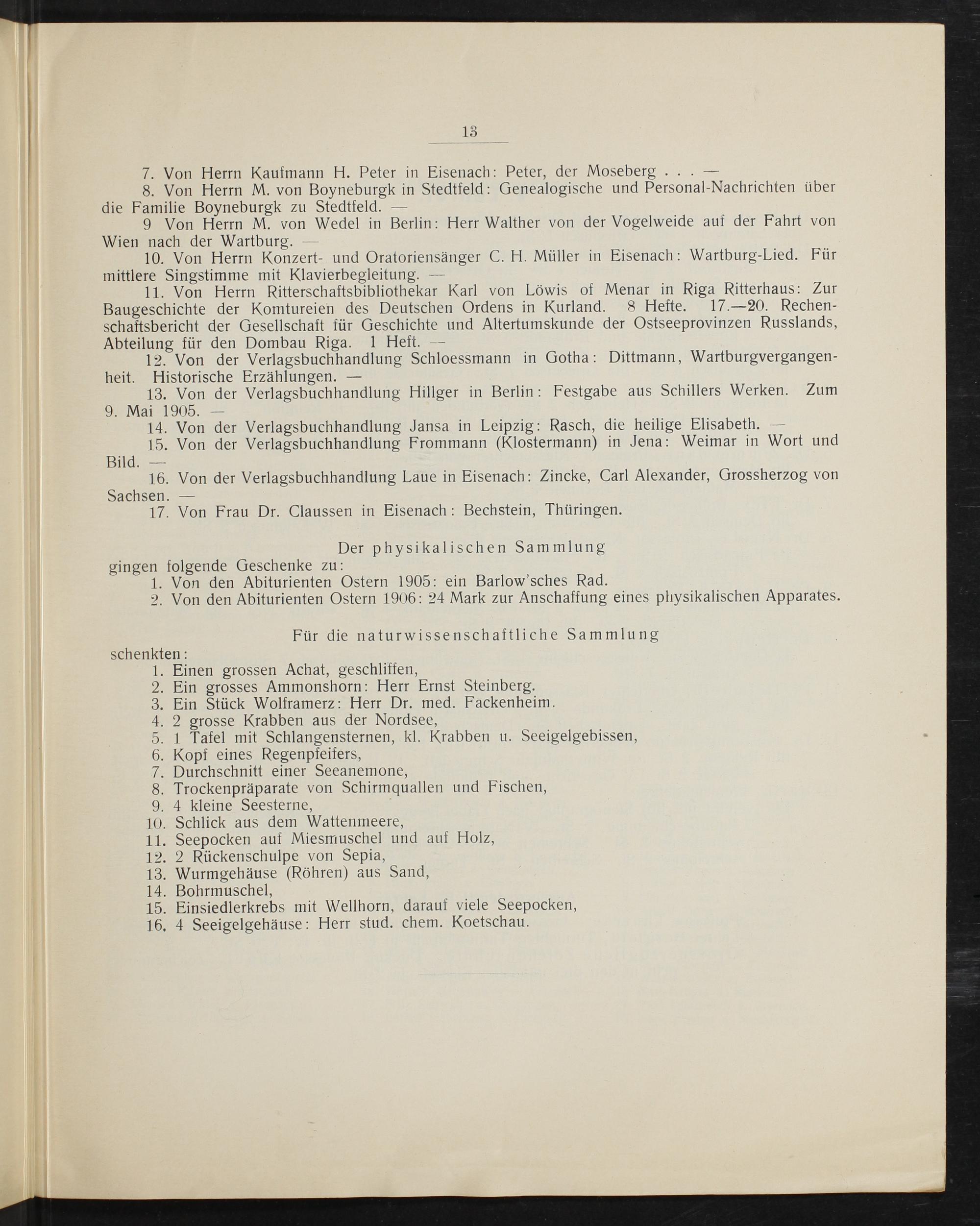 schenkten: 1. Einen grossen Achat, geschliffen, 2. Ein grosses Ammonshorn: Herr Ernst Steinberg. 3. Ein Stück Wolframerz: Herr Dr. med. Fackenheim. 4. 2 grosse Krabben aus der Nordsee, 5. 1 Tafel mit Schlangensternen, kl. Krabben u. Seeigelgebissen, 6. Kopf eines Regenpfeifers, 7. Durchschnitt einer Seeanemone, 8. Trockenpräparate von Schirmquallen und Fischen, 9. 4 kleine Seesterne,