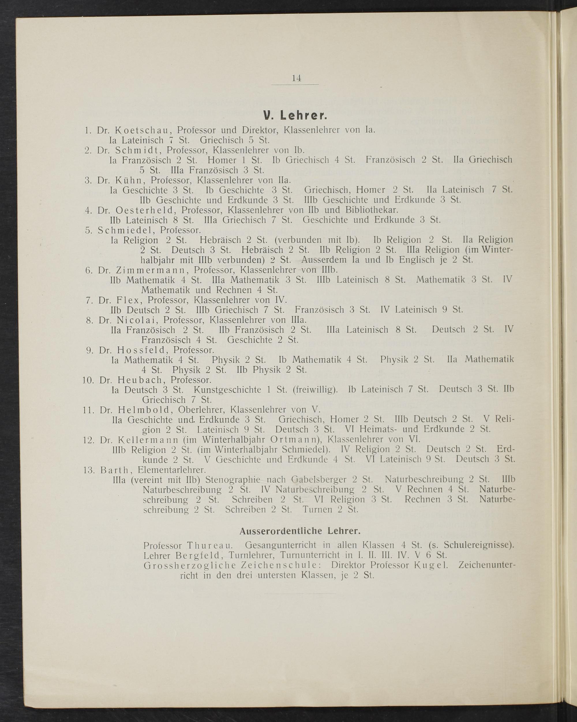 Ausserordentliche Lehrer. Professor Thureau. Gesangunterricht in allen Klassen 4 St.(s. Schulereignisse). Lehrer Bergfeld, lurrllehrer, Lurnunterricht in I. II. III. IV. V 6 St. Grossherzogliche Zeichenschule: Direktor Professor Kugel. Zeichenunter- richt in den drei untersten Klassen, je 2 St.
