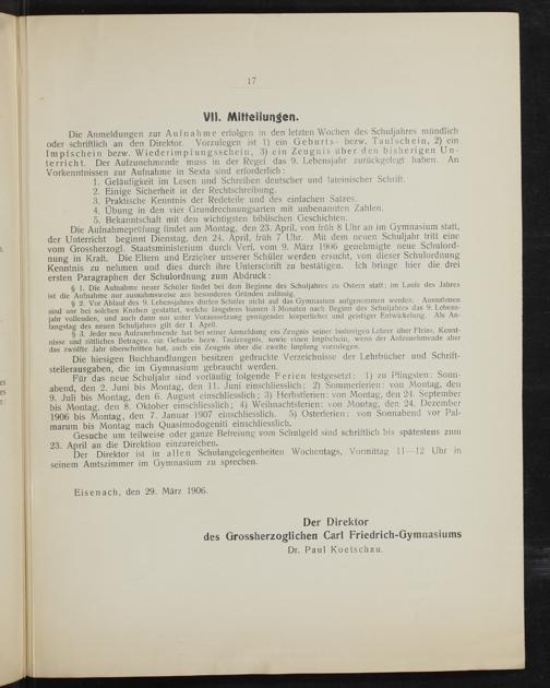 Die Aufnahmeprüfung findet am Montag, den 23. April, von früh 8 Uhr an im Gymnasium statt, er Unterricht beginnt Dienstag, den 24. April, frün 7 Uhr. Mit dem neuen Schuljahr tritt eine vom Grossherzogl. Staatsministerium durch Verf. vom 9. März 1906 genehmigte neue Schulord- nung in Kraft. Die Eltern und Erzieher unserer Schüler werden ersucht, von dieser Schulordnung Kenntnis zu nehmen und dies durch ihre Unterschrift zu bestätigen. Ich bringe hier die drei ersten Paragraphen der Schulordnung zum Abdruck: