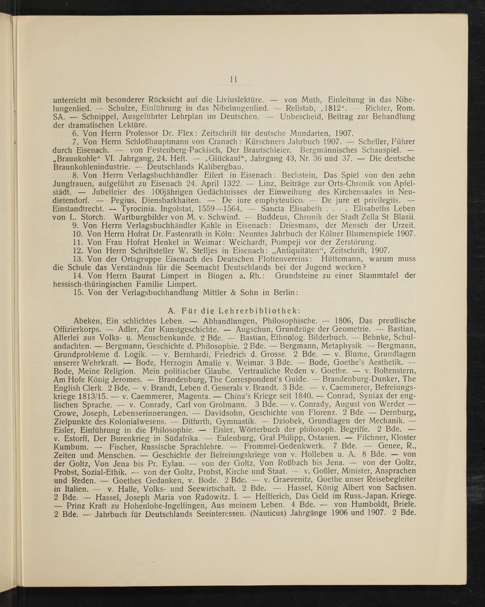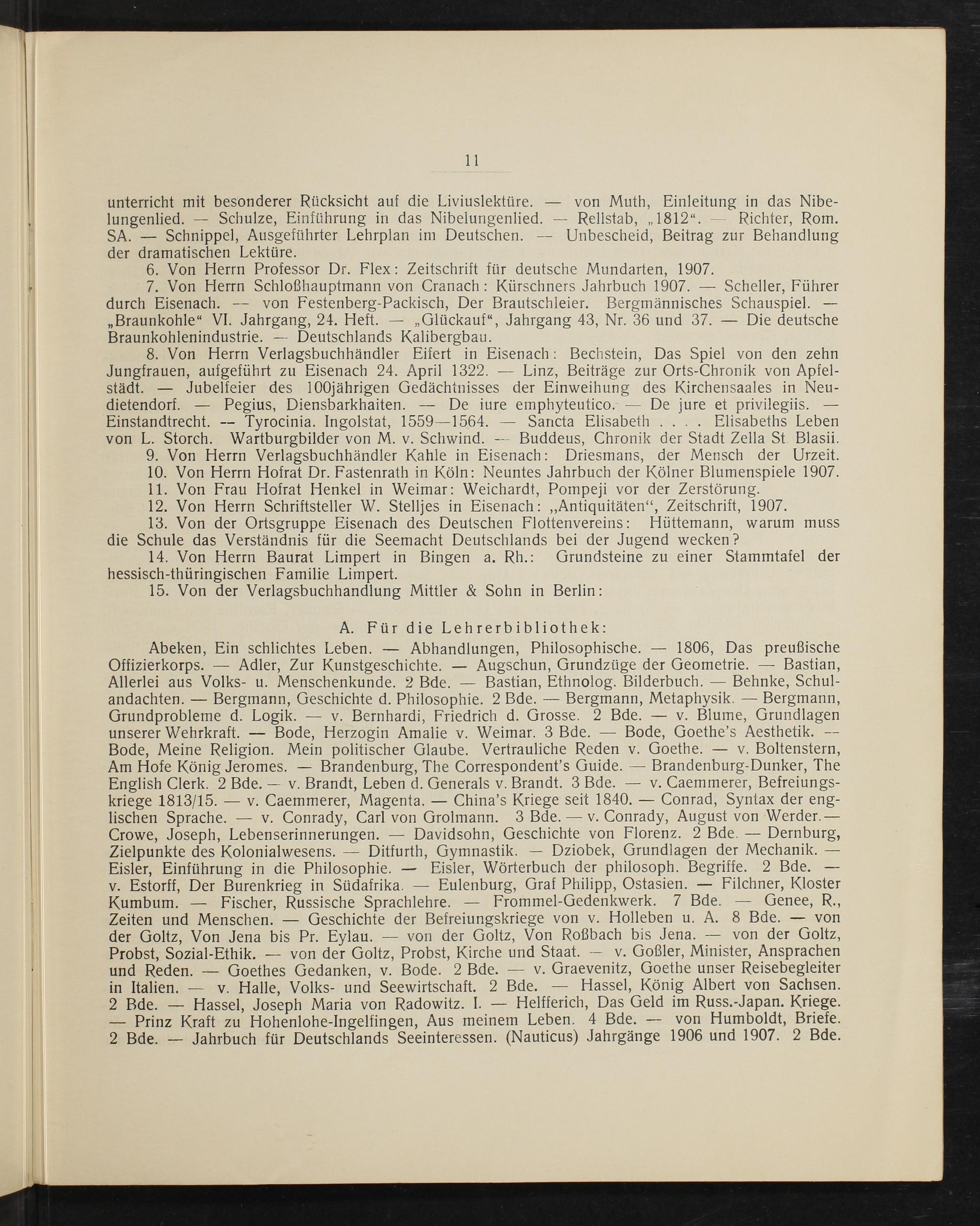 von L. Storch. Wartburgbilder von M. v. Schwind.— Buddeus, Chronik der Stadt Zella St Blasii. 9. Von Herrn Verlagsbuchhändler Kahle in Eisenach: Driesmans, der Mensch der Urzeit. 10. Von Herrn Hofrat Dr. Fastenrath in Köln: Neuntes Jahrbuch der Kölner Blumenspiele 1907. 11. Von Frau Hofrat Henkel in Weimar: Weichardt, Pompeji vor der Zerstörung. 12. Von Herrn Schriftsteller W. Stelljes in Eisenach:„Antiquitäten“, Zeitschrift, 1907. 13. Von der Ortsgruppe Eisenach des Deutschen Flottenvereins: Hüttemann, warum muss die Schule das Verständnis für die Seemacht Deutschlands bei der Jugend wecken? 14. Von Herrn Baurat Limpert in Bingen a. Rh.: Grundsteine zu einer Stammtafel der hessisch-thüringischen Familie Limpert. 15. Von der Verlagsbuchhandlung Mittler& Sohn in Berlin: