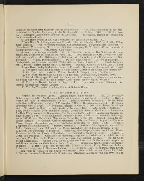 Abeken, Ein schlichtes Leben.— Abhandlungen, Philosophische.— 1806, Das preußische Offizierkorps.— Adler, Zur Kunstgeschichte.— Augschun, Grundzüge der Geometrie.— Bastian, Allerlei aus Volks- u. Menschenkunde. 2 Bde.— Bastian, Ethnolog. Bilderbuch.— Behnke, Schul- andachten.— Bergmann, Geschichte d. Philosophie. 2 Bde.— Bergmann, Metaphysik.— Bergmann, Grundprobleme d. Logik.— v. Bernhardi, Friedrich d. Grosse. 2 Bde.— v. Blume, Grundlagen unserer Wehrkraft.— Bode, Herzogin Amalie v. Weimar. 3 Bde.— Bode, Goethe’s Aesthetik.— Bode, Meine Religion. Mein politischer Glaube. Vertrauliche Reden v. Goethe.— v. Boltenstern, Am Hofe König Jeromes.— Brandenburg, The Correspondent's Guide.— Brandenburg-Dunker, The English Clerk. 2 Bde.— v. Brandt, Leben d. Generals v. Brandt. 3 Bde.— v. Caemmerer, Befreiungs- kriege 1813/15.— v. Caemmerer, Magenta.— China's Kriege seit 1840.— Conrad, Syntax der eng- lischen Sprache.— v. Conrady, Carl von Grolmann. 3 Bde.— v. Conrady, August von Werder.— Crowe, Joseph, Lebenserinnerungen.— Davidsohn, Geschichte von Florenz. 2 Bde.— Dernburg, Zielpunkte des Kolonialwesens.— Ditfurth, Gymnastik.— Dziobek, Grundlagen der Mechanik.— Eisler, Einführung in die Philosophie.— Eisler, Wörterbuch der philosoph. Begriffe. 2 Bde.— v. Estorff, Der Burenkrieg in Südafrika.— Eulenburg, Graf Philipp, Ostasien.— Filchner, Kloster Kumbum.— Fischer, Russische Sprachlehre.— Frommel-Gedenkwerk. 7 Bde.— Genee, R., Zeiten und Menschen.— Geschichte der Befreiungskriege von v. Holleben u. A. 8 Bde.— von der Goltz, Von Jena bis Pr. Eylau.— von der Goltz, Von Roßbach bis Jena.— von der Goltz, Probst, Sozial-Ethik.— von der Goltz, Probst, Kirche und Staat.— v. Goßler, Minister, Ansprachen und Reden.— Goethes Gedanken, v. Bode. 2 Bde.— v. Graevenitz, Goethe unser Reisebegleiter in ltalien.— v. Halle, Volks- und Seewirtschaft. 2 Bde.— Hassel, König Albert von Sachsen. 2 Bde.— Hassel, Joseph Maria von Radowitz. I.— Helfferich, Das Geld im Russ.-Japan. Kriege. — Prinz Kraft zu Hohenlohe-Ingelfingen, Aus meinem Leben. 4 Bde.— von Humboldt, Briefe. 2 Bde.— Jahrbuch für Deutschlands Seeinteressen.(Nauticus) Jahrgänge 1906 und 1907. 2 Bde.