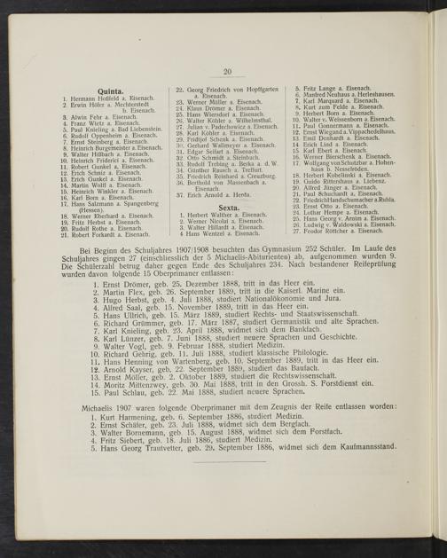 b. Eisenach. 2 3. Alwin Fehr a. Eisenach. 25 4. Franz Wietz a. Eisenach. 26 5. Paul Knieling a. Bad Liebenstein. 27 6. Rudolf Oppenheim a. Eisenach. V 28 7. Ernst Steinberg a. Eisenach. 29 8. Heinrich Burgemeister a. Eisenach. 30 9. Walter Hißbach a. Eisenach. 31 10. Heinrich Friderici a. Eisenach. 32 11. Robert Gunkel a. Eisenach. 33 12. Erich Schniz a. Eisenach. 34 13. Erich Gunkel a. Eisenach. 35 14. Martin Wolff a. Eisenach. 36 15. Heinrich Winkler a. Eisenach. 16. Karl Born a. Eisenach. V 37 17. Hans Salzmann a. Spangenberg (Hessen). 18. Werner Eberhard a. Eisenach. 1 19. Fritz Herbst a. Eisenach. 2 20. Rudolf Rothe a. Eisenach. 3 21. Robert Forkardt a. Eisenach. 4 Bei Beginn des Schuljahres 1907
