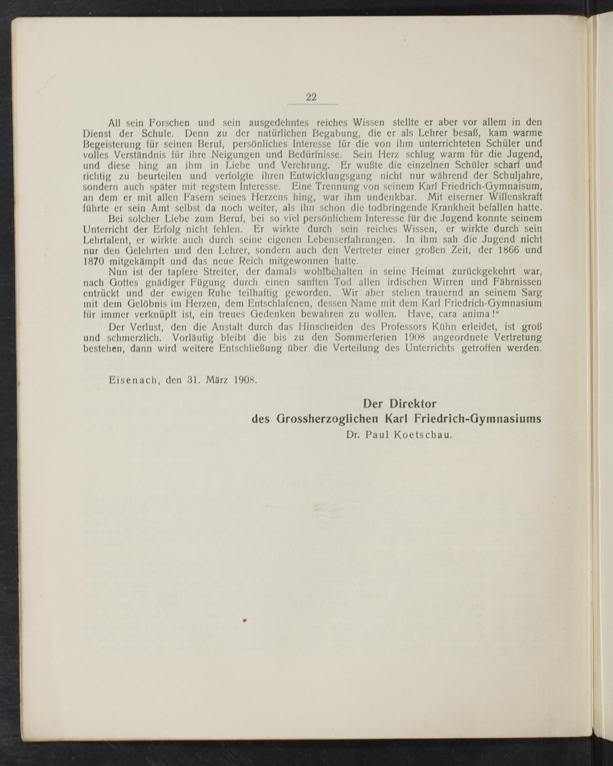 Der Verlust, den die Anstalt durch das Hinscheiden des Professors Kühn erleidet, ist groß und schmerzlich. Vorläufig bleibt die bis zu den Sommerferien 1908 angeordnete Vertretung bestehen, dann wird weitere Entschließung über die Verteilung des Unterrichts getroffen werden.