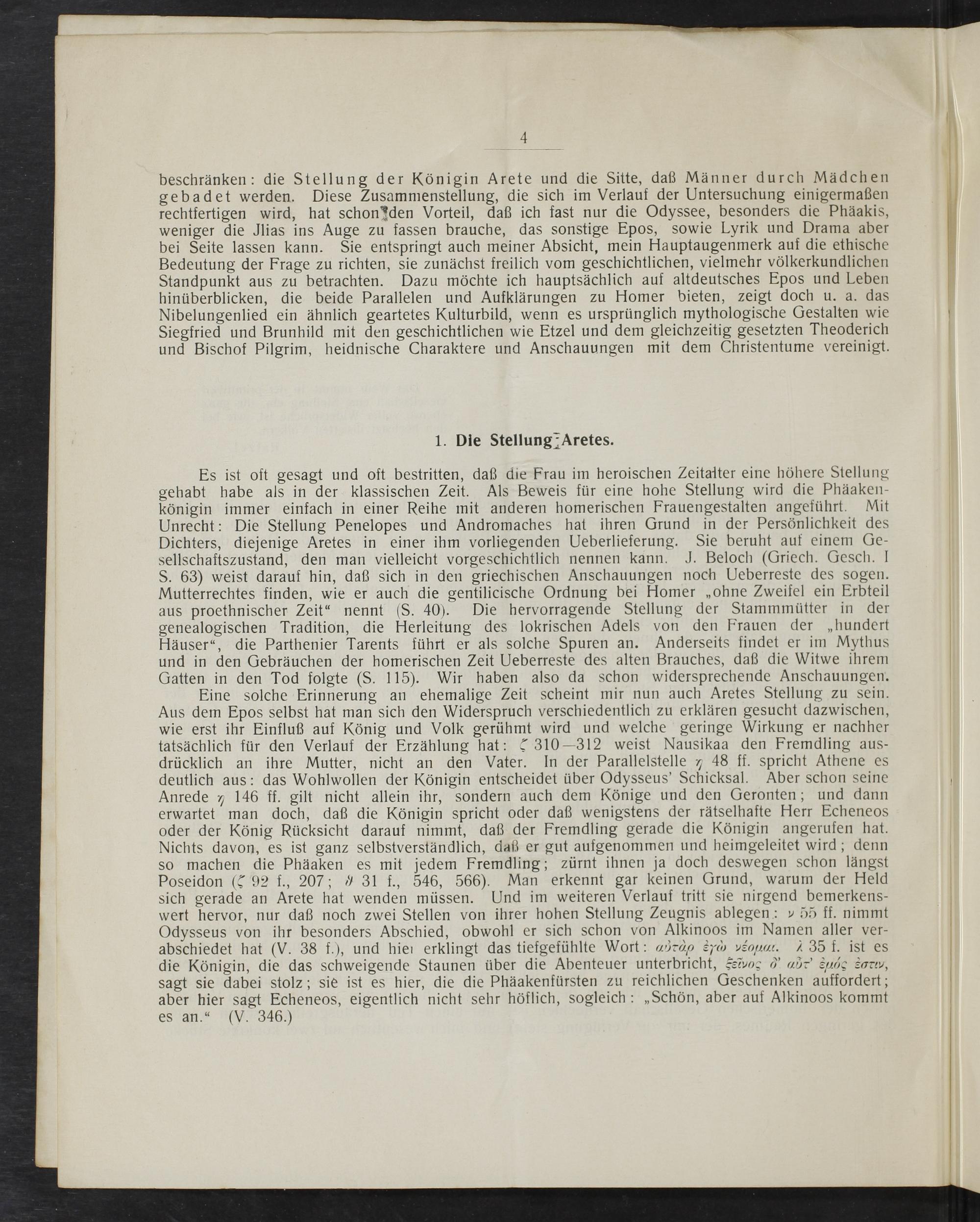 Es ist oft gesagt und oft bestritten, daß die Frau im heroischen Zeitatter eine höhere Stellung gehabt habe als in der klassischen Zeit. Als Beweis für eine hohe Stellung wird die Phäaken- königin immer einfach in einer Reihe mit anderen homerischen Frauengestalten angeführt. Mit Unrecht: Die Stellung Penelopes und Andromaches hat ihren Grund in der Persönlichkeit des Dichters, diejenige Aretes in einer ihm vorliegenden Ueberlieferung. Sie beruht auf einem Ge- sellschaftszustand, den man vielleicht vorgeschichtlich nennen kann. J. Beloch(Griech. Gesch. S. 63) weist darauf hin, daß sich in den griechischen Anschauungen noch Ueberreste des sogen. Mutterrechtes finden, wie er auch die gentilicische Ordnung bei Homer„ohne Zweifel ein Erbteil aus proethnischer Zeit“ nennt(S. 40). Die hervorragende Stellung der Stammmütter in der genealogischen Tradition, die Herleitung des lokrischen Adels von den Frauen der„hundert Hâuser“, die Parthenier Tarents führt er als solche Spuren an. Anderseits findet er im Mythus und in den Gebräuchen der homerischen Zeit Ueberreste des alten Brauches, daß die Witwe ihrem Gatten in den Tod folgte(S. 115). Wir haben also da schon widersprechende Anschauungen.