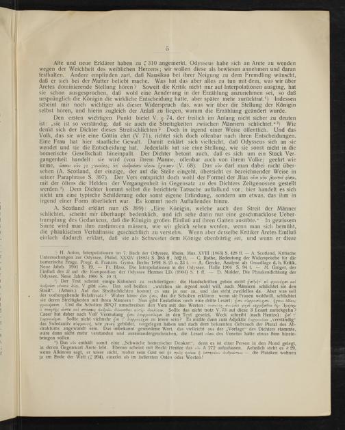 A. Scotland erklärt nun(S. 399):„Eine Königin, welche auch den Streit der Männer schlichtet, scheint mir überhaupt bedenklich, und ich sehe darin nur eine geschmacklose Ueber- trumpfung des Gedankens, daß die Königin großen Einfluß auf ihren Gatten ausübte.“ In gewissem Sinne wird man ihm zustimmen müssen, wie wir gleich sehen werden, wenn man sich bemüht, die phäakischen Verhältnisse geschichtlich zu verstehn. Wenn aber derselbe Kritiker Aretes Einfluß einfach dadurch erklärt, daß sie als Schwester dem Könige ebenbürtig sei, und wenn er diese