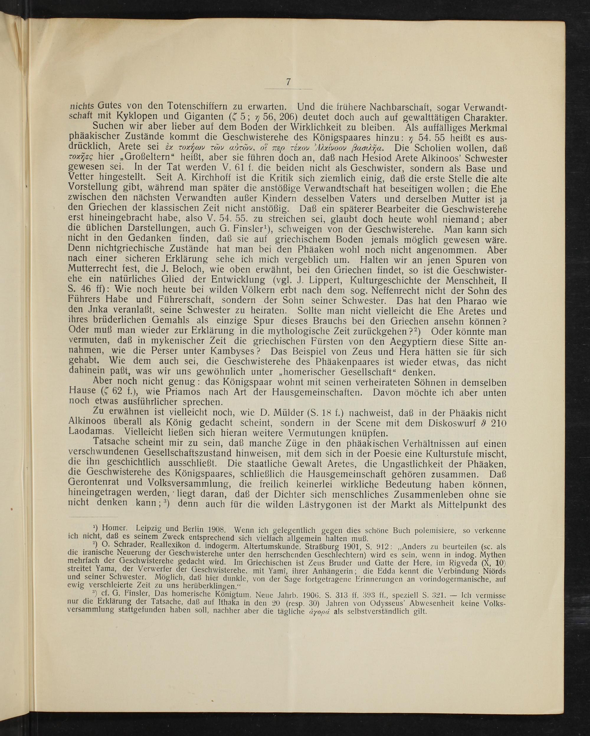 Suchen wir aber lieber auf dem Boden der Wirklichkeit zu bleiben. Als auffälliges Merkmal phäakischer Zustände kommt die Geschwisterehe des Königspaares hinzu:„ 54. 55 heißt es aus- drücklich, Arete sei s-« roxjco dν νατένν! O Térον ⁴ννοον ‿αsa. Die Scholien wollen, daß roxijec hier„Großeltern“ heißt, aber sie führen doch an, daß nach Hesiod Arete Alkinoos' Schwester gewesen sei. In der Tat werden V. 61 f. die beiden nicht als Geschwister, sondern als Base und Vetter hingestellt. Seit A. Kirchhoff ist die Kritik sich ziemlich einig, daß die erste Stelle die alte Vorstellung gibt, während man später die anstößige Verwandtschaft hat beseitigen wollen; die Ehe zwischen den nächsten Verwandten außer Kindern desselben Vaters und derselben Mutter ist ja den Griechen der klassischen Zeit nicht anstößig. Daß ein späterer Bearbeiter die Geschwisterehe erst hineingebracht habe, also V. 54. 55. zu streichen sei, glaubt doch heute wohl niemand; aber die üblichen Darstellungen, auch G. Finsleri), schweigen von der Geschwisterene. Man kann sich nicht in den Gedanken finden, daß sie auf griechischem Boden jemals möglich gewesen wäre. Denn nichtgriechische Zustände hat man bei den Phäaken wohl noch nicht angenommen. Aber nach einer sicheren Erklärung sehe ich mich vergeblich um. Halten wir an jenen Spuren von Mutterrecht fest, die J. Beloch, wie oben erwähnt, bei den Griechen findet, so ist die Geschwister- ehe ein natürliches Glied der Entwicklung(vgl. J. Lippert, Kulturgeschichte der Menschheit, I S. 46 ff): Wie noch heute bei wilden Völkern erbt nach dem sog. Neffenrecht nicht der Sohn des Führers Habe und Führerschaft, sondern der Sohn seiner Schwester. Das hat den Pharao wie den Inka veranlaßt, seine Schwester zu heiraten. Sollte man nicht vielleicht die Ehe Aretes und ihres brüderlichen Gemahls als einzige Spur dieses Brauchs bei den Griechen ansehn können? Oder muß man wieder zur Erklärung in die mythologische Zeit zurückgehen?²) Oder könnte man vermuten, daß in mykenischer Zeit die griechischen Fürsten von den Aegyptiern diese Sitte an- nahnmen, wie die Perser unter Kambyses? Das Beispiel von Zeus und Hera hätten sie für sich gehabt. Wie dem auch sei, die Geschwisterehe des Phäakenpaares ist wieder etwas, das nicht dahinein paßt, was wir uns gewöhnlich unter„homerischer Gesellschaft“ denken.