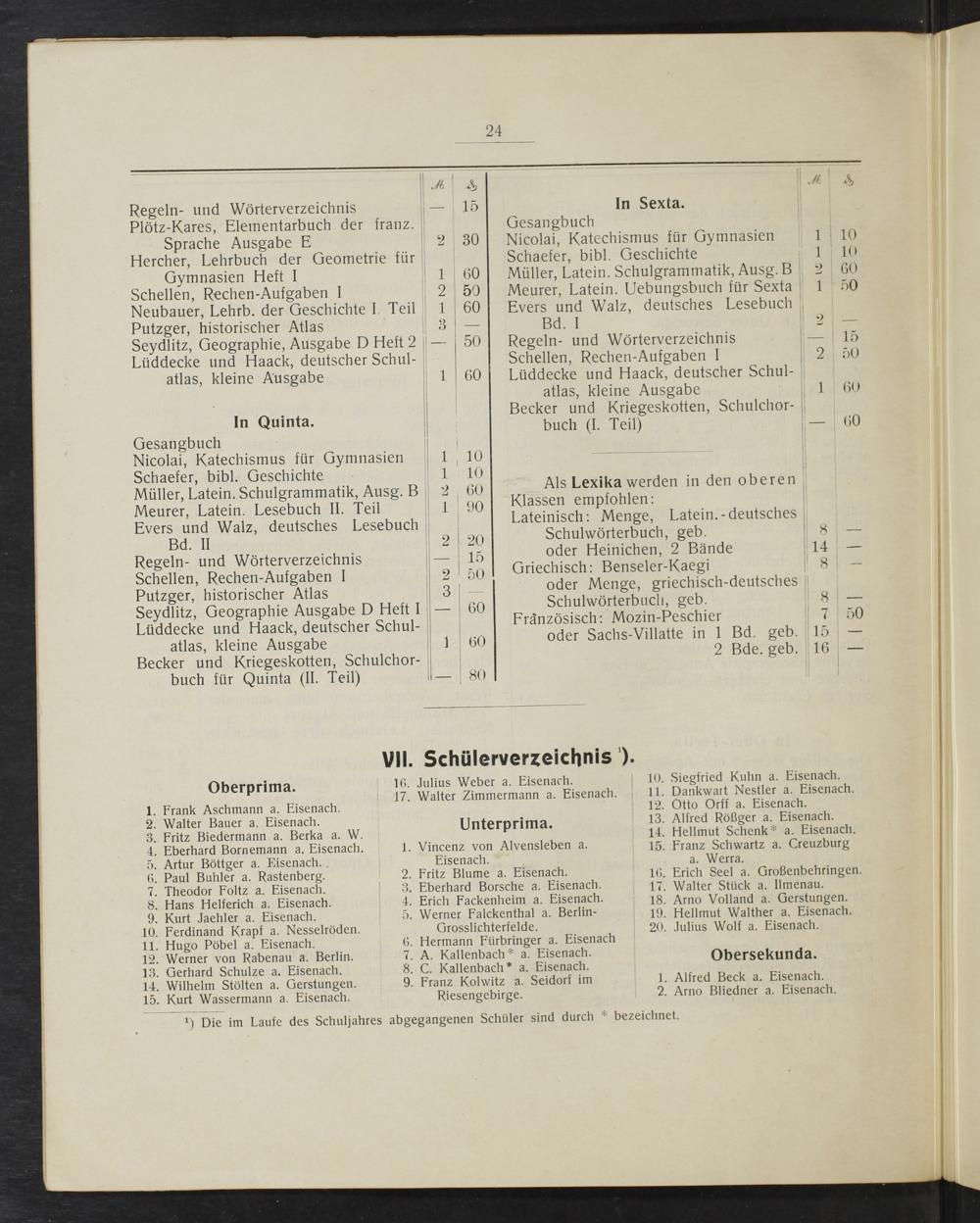 Oberprima. 16. Julius Weber a. Eisenach. 10. Siegfried Kuhn a. Eisenach. 17. Walter Zimmermann a. Eisenach. 11. Dankwart Nestler a. Eisenach.