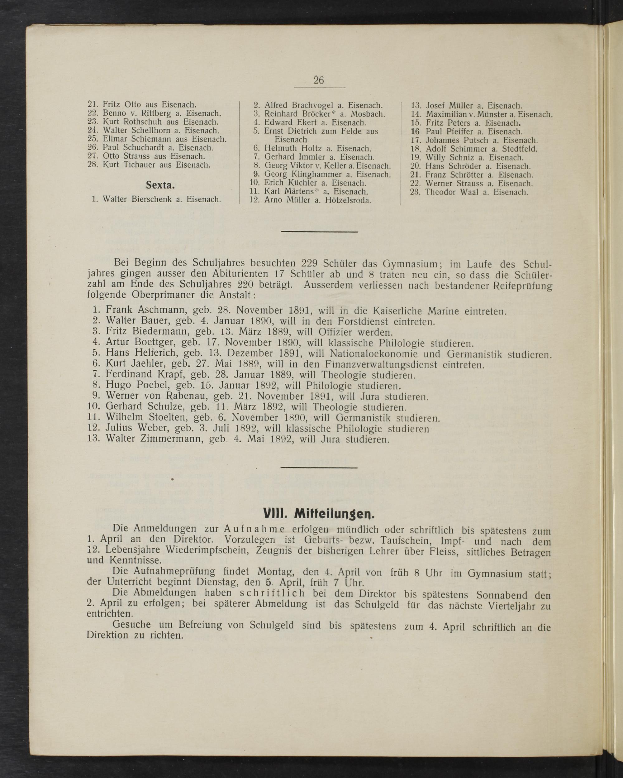 . Frank Aschmann, geb. 28. November 1891, will in die Kaiserliche Marine eintreten. Walter Bauer, geb. 4. Januar 1890, will in den Forstdienst eintreten.