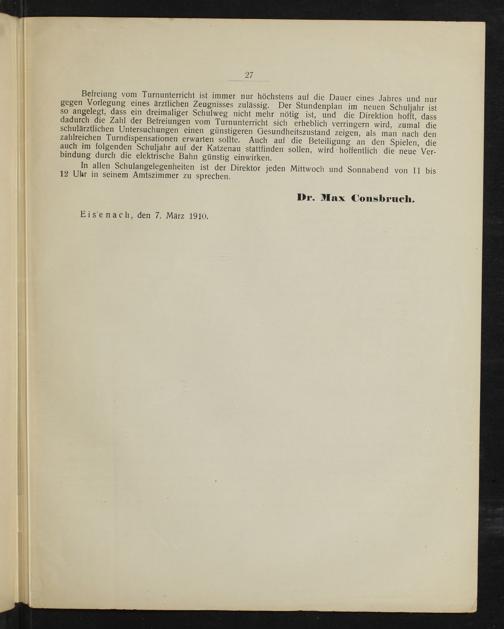 Befreiung vom Turnunterricht ist immer nur höchstens auf die Dauer eines Jahres und nur gegen Vorlegung eines ärztlichen Zeugnisses zuläâssig. Der Stundenplan im neuen Schuljahr ist so angelegt, dass ein dreimaliger Schulweg nicht mehr nötig ist, und die Direktion hofft, dass dadurch die Zahl der Befreiungen vom Turnunterricht sich erheblich verringern wird, zumal die schulärztlichen Untersuchungen einen günstigeren Gesundheitszustand zeigen, als man nach den zahlreichen Turndispensationen erwarten sollte. Auch auf die Beteiligung an den Spielen, die auch im folgenden Schuljahr auf der Katzenau stattfinden sollen, wird hoffentlich die neue Ver- bindung durch die elektrische Bahn günstig einwirken.