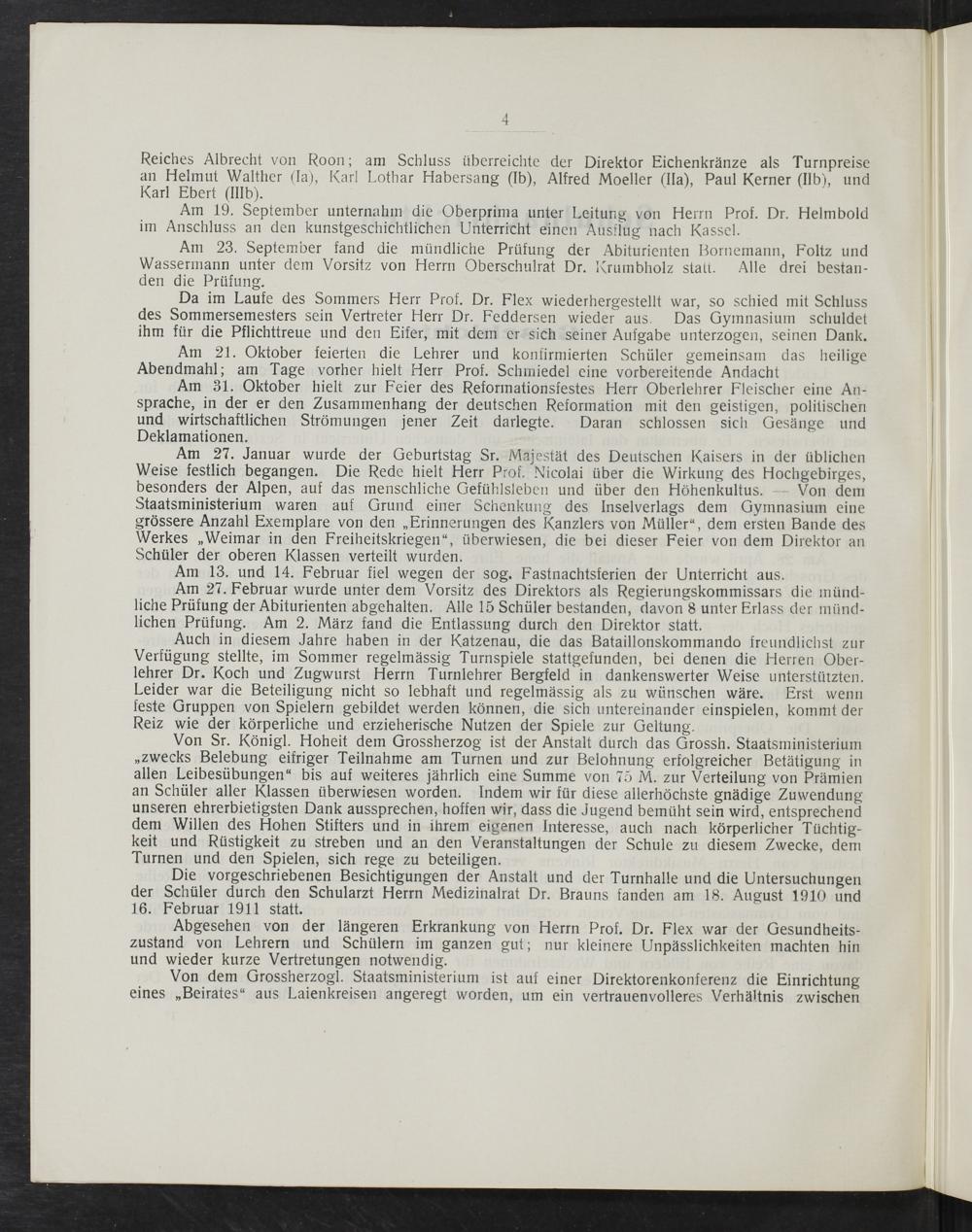 Am 27. Januar wurde der Geburtstag Sr. Majestät des Deutschen Kaisers in der üblichen Weise festlich begangen. Die Rede hielt Herr Prof. Nicolai über die Wirkung des Hochgebirges, besonders der Alpen, auf das menschliche Gefühlsleben und über den Höhenkultus. Von dem Staatsministerium waren auf Grund einer Schenkung des Inselverlags dem Gymnasium eine grössere Anzahl Exemplare von den„Erinnerungen des Kanzlers von Müller“, dem ersten Bande des Werkes„Weimar in den Freiheitskriegen“, überwiesen, die bei dieser Feier von dem Direktor an Schüler der oberen Klassen verteilt wurden.