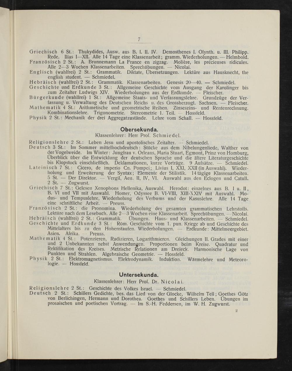 Untersekunda. Klassenlehrer: Herr Prof. Dr. Nicolai. Religionslehre 2 St.: Geschichte des Volkes Israel.— Schmiedel. Deutsch 2 St.: Schillers Gedichte, bes. das Lied von der Glocke, Wilhelm Tell; Goethes Götz
