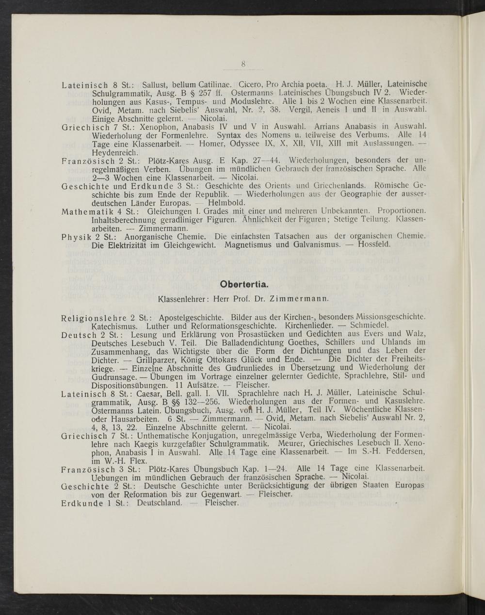 Lateinisch 8 St.: Sallust, bellum Catilinae. Cicero, Pro Archia poeta. H. J. Müller, Lateinische Schulgrammatik, Ausg. B§ 257 ff. Ostermanns Lateinisches Ubungsbuch IV 2. Wieder- holungen aus Kasus-, Tempus- und Moduslehre. Alle 1 bis 2 Wochen eine Klassenarbeit. Ovid, Metam. nach Siebelis' Auswahl, Nr. 2, 38. Vergil, Aeneis I und II in Auswahl. Einige Abschnitte gelernt. Nicolai.