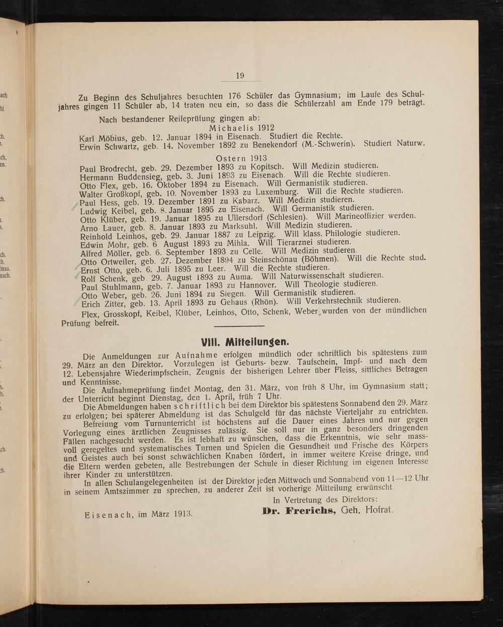Ostern 1913 Paul Brodrecht, geb. 29. Dezember 1893 zu Kopitsch. Will Medizin studieren. Hermann Buddensieg, geb. 3. Juni 1893 zu Eisenach. Will die Rechte studieren. Otto Flex, geb. 16. Oktober 1894 zu Eisenach. Will Germanistik studieren. Walter Großkopf, geb. 10. November 1893 zu Luxemburg. Will die Rechte studieren. Paul Hess, geb. 19. Dezember 1891 zu Kabarz. Will Medizin studieren. Ludwig Keibel, geb. 8. Januar 1895 zu Eisenach. Will Germanistik studieren. Otto Klüber, geb. 19. Januar 1895 zu Ullersdorf(Schlesien). Will Marineoffizier werden. Arno Lauer, geb. 8. Januar 1893 zu Marksuhl. Will Medizin studieren. Reinhold Leinhos, geb. 29. Januar 1887 zu Leipzig. Will klass. Philologie studieren. Edwin Mohr, geb. 6 August 1893 zu Mihla. Will Tierarznei studieren. Alfred Möller, geb. 6. September 1893 zu Celle. Will Medizin studieren. Otto Ortweiler, geb. 27. Dezember 1894 zu Steinschönau(Böhmen). Will die Rechte stud. Ernst Otto, geb. 6. Juli 1895 zu Leer. Will die Rechte studieren. Rolf Schenk, geb. 29. August 1893 zu Auma. Will Naturwissenschaft studieren. Paul Stuhlmann, geb. 7. Januar 1893 zu Hannover. Will Theologie studieren. Otto Weber, geb. 26. Juni 1894 zu Siegen. Will Germanistik studieren. Erich Zitter, geb. 13. April 1893 zu Gehaus(Rhön). Will Verkehrstechnik studieren.