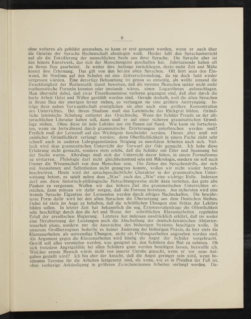 ohne weiteres als gebildet anzusehen, so kann er erst genannt werden, wenn er auch über die Gesetze der Sprache Rechenschaft abzulegen weiß. Herder faßt den Sprachunterricht auf als die Entzifferung der menschlichen Seele aus ihrer Sprache. Die Sprache aber ist das feinste Kunstwerk, das sich der Menschengeist geschaffen hat. Jahrtausende haben oft an ihrem Bau gearbeitet. Je weiter ihre Anfänge zurückliegen, desto mehr Zeit und Mühe kostet ihre Erlernung. Das gilt von den beiden alten Sprachen. Oft hört man den Ein- wand, ihr Studium auf den Schulen sei eine Zeitverschwendung, da sie doch bald wieder vergessen würden. Eine derartige Behauptung ist genau so einseitig, als wollte jemand die Zwecklosigkeit der Mathematik damit beweisen, daß die meisten Menschen später nicht mehr mathematische Formeln kennten oder imstande wären, einen Logarithmus aufzuschlagen. Man übersieht dabei, daß zwar Einzelkenntnisse verloren gegangen sind, daß aber durch die harte Arbeit Geist und Willen gestählt worden sind. Gerade deshalb, weil die alten Sprachen in ihrem Bau der unsrigen ferner stehen, so verlangen sie eine größere Anstrengung. In- folge ihrer nahen Verwandtschaft ermöglichen sie aber auch eine größere Konzentration des Unterrichtes. Bei ihrem Studium muß das Lateinische das Rückgrat bilden. Gründ- liche lateinische Schulung entlastet das Criechische. Wenn der Schüler Freude an der alt- sprachlichen Literatur haben soll, dann muß er auf einer sicheren grammatischen Grund- lage stehen. Ohne diese ist jede Lektüre nur ein Bauen auf Sand. Wie kann sie fortschrei- ten, wenn sie fortwährend durch grammatische Frörterungen unterbrochen werden muß! Freilich muß der Lernstoff auf das Wichtigste beschränkt werden. Dieses aber muß mit peinlicher Gründlichkeit verlangt werden; denn Oberflächlichkeit in einem Fache zieht sehr schnell auch in anderen Lehrgegenständen Neigung zu unsolidem Arbeiten nach sich. Viel- fach wird dem grammatischen Unterricht der Vorwurf der Ode gemacht. Ich habe diese FErfahrung nicht gemacht, sondern stets erlebt, daß die Schüler mit Eifer und Spannung bei der Sache waren. Allerdings muß sich der Unterricht davor hüten, in einem Formalismus zu erstarren. Philologie darf nicht gleichbedeutend sein mit Mikrologie, sondern sie soll nach Usener die Wissenschaft von dem Menschen sein. Die Zeiten des Sprachendrills, der sich mit Ausnahmen und Seltenheiten nicht genug tun konnte, wollen wir nicht wieder herauf- beschwören. Heute wird der sprachgeschichtliche Charakter in der grammatischen Unter- weisung betont, es spielt neben dem„Was“ auch das„Wie“ eine wichtige Rolle. Indessen darf uns diese historisch-philologische Betrachtungsweise nicht dazu verleiten, das gute alte Pauken zu vergessen. Wollen wir das höhere Ziel des grammatischen Unterrichtes er- reichen, dann müssen wir dafür sorgen, daß die Formen festsitzen. Am sichersten wird eine fremde Sprache Eigentum der Lernenden werden durch eifriges Nachschaffen. Die bewähr- teste Form dafür wird bei den alten Sprachen die Ubersetzung aus dem Deutschen bleiben. Dabei ist stets im Auge zu behalten, daß die schriftlichen UÜbungen eine Stütze der Lektüre bilden sollen. In letzter Zeit hat bekanntlich die sog. Extemporalienfrage die Offentlichkeit sehr beschäftigt durch den die Art und Weise der schriftlichen Klassenarbeiten regelnden Frlaß der preußischen Regierung. Letztere hat indessen ausdrücklich erklärt, daß sie weder eine Herabsetzung der Leistungen noch die Abschaffung der deutsch-lateinischen Abiturien- tenarbeit plane, sondern nur die Auswüchse des bisherigen Systems beseitigen wolle. In unserem Großherzogtum bedurfte es keiner Anderung der bisherigen Praxis, da hier stets die Klassenarbeiten als notwendige UÜbungen, nicht als Prüfungsarbeiten angesehen worden sind. Als Argument gegen die Klassenarbeiten wird häufig die Angst der Schüler vorgebracht. Gewiß soll alles vermieden werden, was geeignet ist, den Schülern den Mut zu nehmen. Ob sich trotzdem Angstgefühle bei allen Schülern ganz werden beseitigen lassen, bezweifle ich. Welcher ernste Mensch würde nicht von innerer Unruhe gepackt, wenn er vor neue Auf- gaben gestellt wird? Ich bin aber der Ansicht, daß die Angst geringer sein wird, wenn be— stimmte Termine für die Arbeiten festgesetzt sind, als wenn, wie es in Preußen der Fall ist, ohne vorherige Ankündigung in größeren Zwischenräumen Arbeiten verlangt werden. Da-
